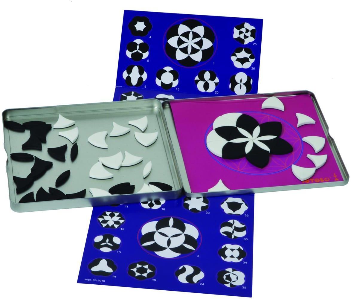 IOTOBO - Podróżna układanka magnetyczna - MINIZEN - puzzle mandale 3 kształty i nieskończona liczba kombinacji! Kompaktowa gra magnetyczna MINI ZEN od francuskiej marki iOTOBO to koniec z nudnymi, długimi podróżami. Układanka w metalowym pudełku skutecznie zamieni dłużące się godziny w fascynującą podróż po dziecięcej wyobraźni. Przepiękne czarno-białe mandale czekają na zabawę. Metalowe pudełko zawiera 60 magnesów w czarno-białych kolorach oraz 1 arkusz z 35 wzorami do odtworzenia. Zadaniem dziecka jest wybrać wzór, znaleźć pasujące magnesy i spróbować odtworzyć rysunek za ich pomocą. Gra praktycznie nigdy się nie kończy: poza podanymi wzorami można też tworzyć swoje unikalne kompozycje. Układanki magnetyczne od iOTOBO to doskonały trening cierpliwości i skupienia, pogłębiający umiejętności motoryczne i niesamowicie rozwijający wyobraźnię nie tylko u dzieci. We Francji produkty iOTOBO wykorzystywane są w domach opieki dla osób starszych jako element terapii, wspomagający sprawność poznawczą, pamięć, oraz ćwiczący koordynację ruchową i koncentrację. Podróżne opakowanie pozwala na zabawę w każdym miejscu i czasie! Zabawka do samodzielnej lub wspólnej zabawy: rzuć wyzwanie przyjaciołom lub rodzinie, kto szybciej ułoży układankę lub stworzy bardziej skomplikowany wzór. Ogranicza was tylko wyobraźnia! Zawartość: 1 metalowe pudełko (14 x 12,5 x 1 cm), 60 piankowych magnesów (2 cm) w 2 kolorach (czarne i białe) i 3 kształtach, 1 arkusz z 35 mandalami do ułożenia Wyprodukowane we Francji Wiek: 5+