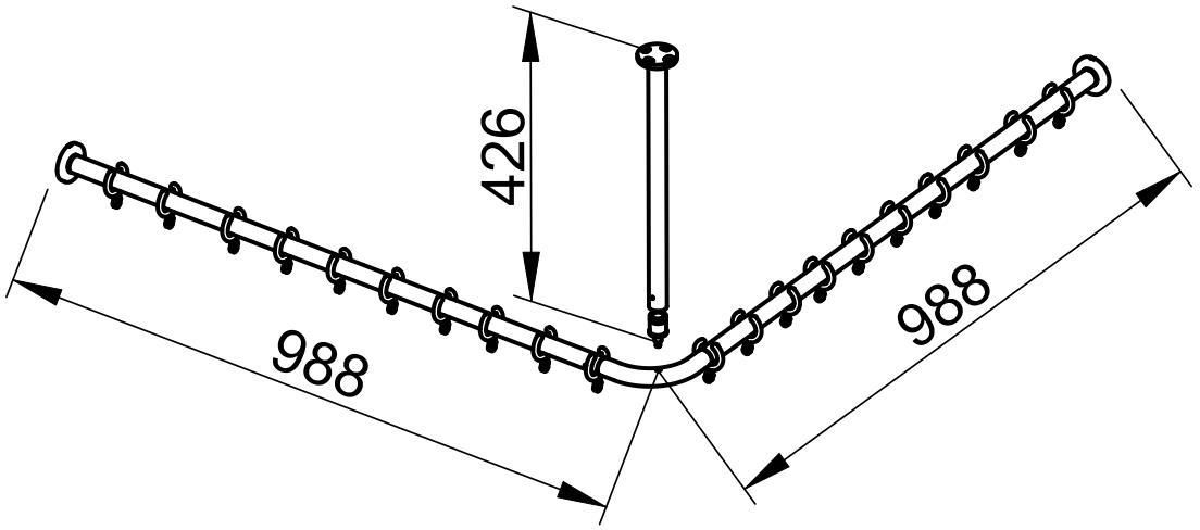 Dla brodzików kwadratowych 1000 x 1000 mm (forma kwadratowa) kompletny zawiera: 3 x zestaw montażowy naścienny 2 x drążek do zasłon prysznicowych 900 mm 1 x element łączeniowy 90° dla brodzików kwadratowych 1 x wspornik sufitowy 400 mm 2 x pierścienie na zasłonkę, białe (1 zestaw zawiera 10 sztuk) 1 x element połączeniowy