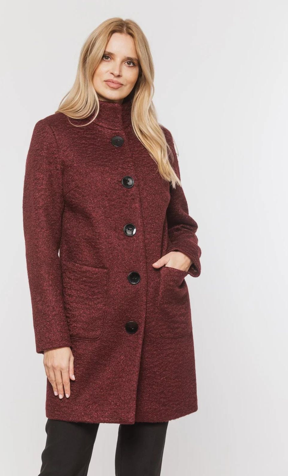 Płaszcz damski Przejściowy, prosty płaszcz damski we wzór w wielokolorowy przeplot, ze stójką, o długości przed kolano. Zapinany na duże, czarne guziki. Minimalistyczny, casualowy fason sprawdzi się na wiele okazji, jak i na co dzień. Posiada 2 zewnętrzne, naszyte kieszenie. Kolor: bordowy (odcień burgund) Skład tkaniny wierzchniej: 100% poliester Skład podszewki: 100% wiskoza Zapięcie: zapinany na duże, czarne guziki Gwarancja: 24 m-ce