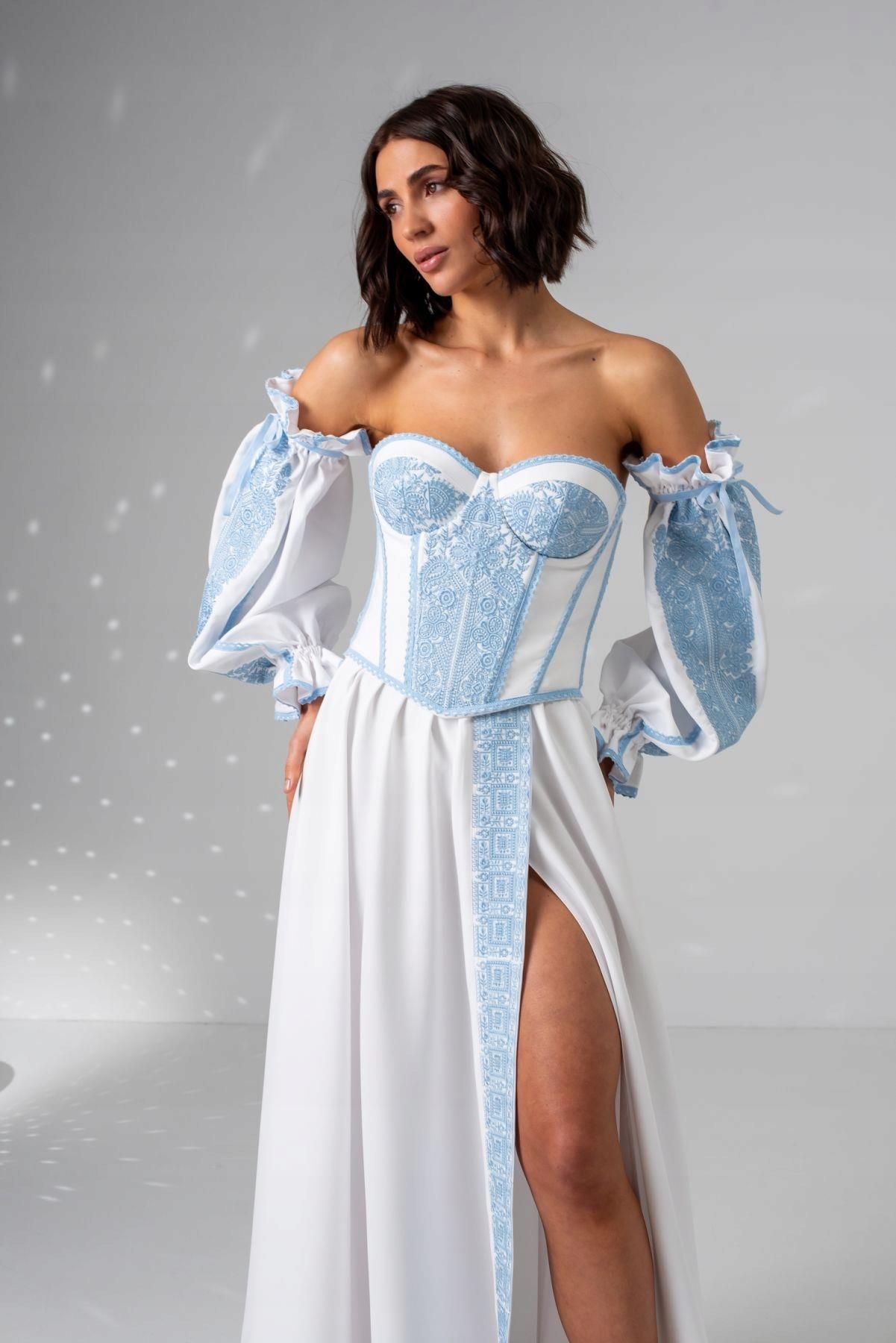 ABSOLUTNA NOWOŚĆ 2025! LIMITOWANA ILOŚĆ! Zachwycająca suknia której klasyczna elegancja łączy się z wyrafinowanym folklorem. Trzyczęściowa konstrukcja – gorset, rękawy i spódnica – podkreśla sylwetkę i pozwala na idealne dopasowanie. Mocne wycięcie i subtelny niebieski haft inspirowany etnicznymi motywami nadają kreacji niepowtarzalnego charakteru, łącząc nowoczesny glamour z tradycyjnym pięknem. Każdy detal został zaprojektowany tak, by emanował luksusem i wyjątkowością. Uszyta z luksusowej tkaniny - krepy (65% bawelna, 35% elastan). Wymiary rozmiar 36: Biust na miseczkę 70/75 A - regulowany sznurówkami gorset. Długość spódnicy: 112 cm, Długość rękawa: 55 cm. Idealna na wyjątkowe okazje, kiedy chcesz olśnić elegancją i podkreślić swoją indywidualność. Idealna na wyjątkowe okazje: eleganckie przyjęcia, wieczorne gale, śluby lub ważne ceremonie. Limitowana liczba egzemplarzy sprawia, że każda suknia jest prawdziwym unikatem – dla tych, którzy cenią ekskluzywność i wyjątkowość. Pojedyncze sztuki!