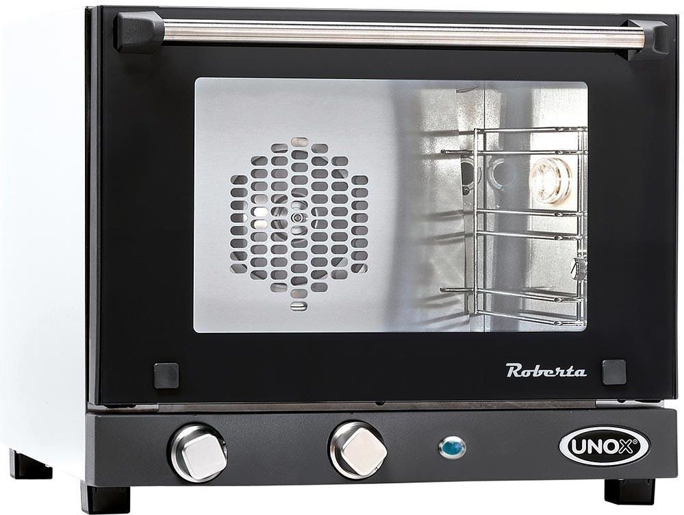 Elektryczny piec konwekcyjny bez nawilżania Roberta 3x 34,2x24,2 cm marki UNOX ze sterowaniem manualnym. Piec idealnie nada się do regeneracji potraw, odpiekania oraz wypiekania. W piecu można umieścić jednocześnie 3 blachy o wymiarach 34,2x24,2 cm. Odległość między półkami 7 cm. Piec posiada zakres temperatury pieczenia od 30 do 260 ºC. Piec konwekcyjny posiada technologię Protek.SAFE, dzięki której zwiększona została wydajność cieplna przy zachowaniu bezpieczeństwa pracy. W obudowie pieca zamontowany została zamontowana kontrolka informująca o pracy pieca. Drzwi pieca otwierają się z góry na dół. Komora wykonana jest ze stali nierdzewnej o wysokiej odporności, która posiada zaokrąglone krawędzie dla łatwiejszego utrzymywania czystości pieca. Wewnątrz komory zastosowano oświetlenie halogenowe. W komorze wbudowane zostały dwa wentylatory z rewersem. Sterowanie odbywa się za pomocą dwóch pokręteł.