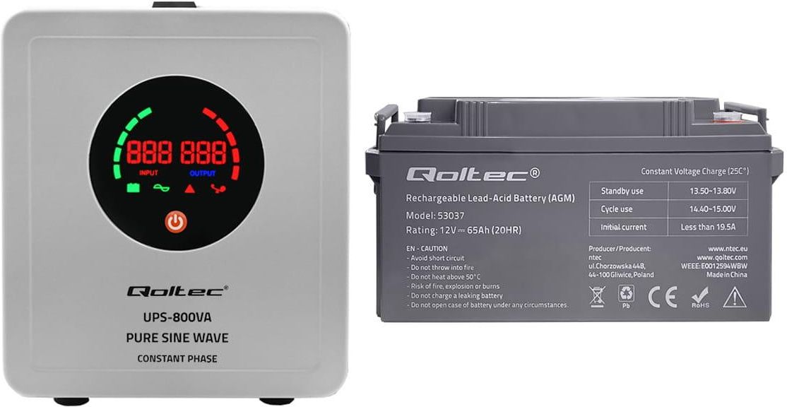 Zestaw: zasilacz awaryjny Qoltec Pure Sine Wave UPS 800VA/560W + akumulator Qoltec AGM LongLife 12V 65Ah Wojkowice
