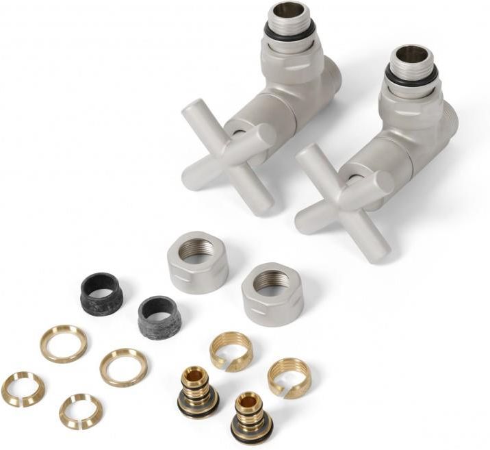 Zestaw Kątowy MINIMALIST Satyna nikielZestaw Regulacyjny Kątowy Minimalist przeznaczony jest do grzejników łazienkowych oraz innych instalacji. Zestaw ZawieraZawór RegulacyjnyZawór Odcinający2 × adapter PEX, ALU-PEX i CU Ø 15...