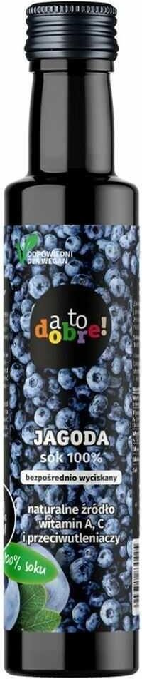 Składniki: Sok z czarnych jagód 100 % Sok 100% z czarnych jagód marki Bioone - bezpośrednio wyciskany w szklanej butelce z serii 'A to dobre!'. Sok nie jest z koncentratu (NFC). Nie jest również dosładzany (zawiera naturalnie występujące cukry) i jest bez dodatków smakowych. Tylko owoce. Sok 100% z owoców - sok z czarnych jagód uważany jest naturalne za antidotum na zatrucia i biegunki. Według informacji producenta, wychwytuje toksyny, pomaga chronić płuca przed pylicą i smogiem, co sprawia, że sok jest idealnym uzupełnieniem diety mieszkańców miast. Sok z jagód to remedium na wiele dolegliwości i silny przeciwutleniacz. Przed spożyciem najlepiej wstrząsnąć butelką - występujący osad jest całkowicie naturalny. Polecamy duży wybór soków 100% z naszej oferty. Wartość odżywcza w 100 g / 100 ml: Wartość energetyczna: 228 kJ / 54 kcal Tłuszcz: 0,6 g w tym kwasy tłuszczowe nasycone: > 0,1 g Węglowodany: 9,6 g w tym cukry: 6,9 g Błonnik: 3,4 g Białko: 0,9 g Sól: < 0,01 g