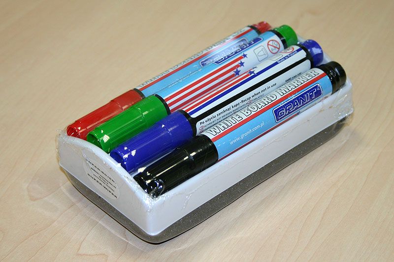 Komplet 4 markerów suchościeralnych z gąbką GRANIT WHITEBOARD Do pisania na planerach i kalendarzach laminowanych tablicach suchościeralnych z naszej oferty innych dowolnych tablicach suchościeralnych. Zestaw zawiera: 4 markery suchościeralne , w uchwycie gąbka do ścierania Inne własciwości …