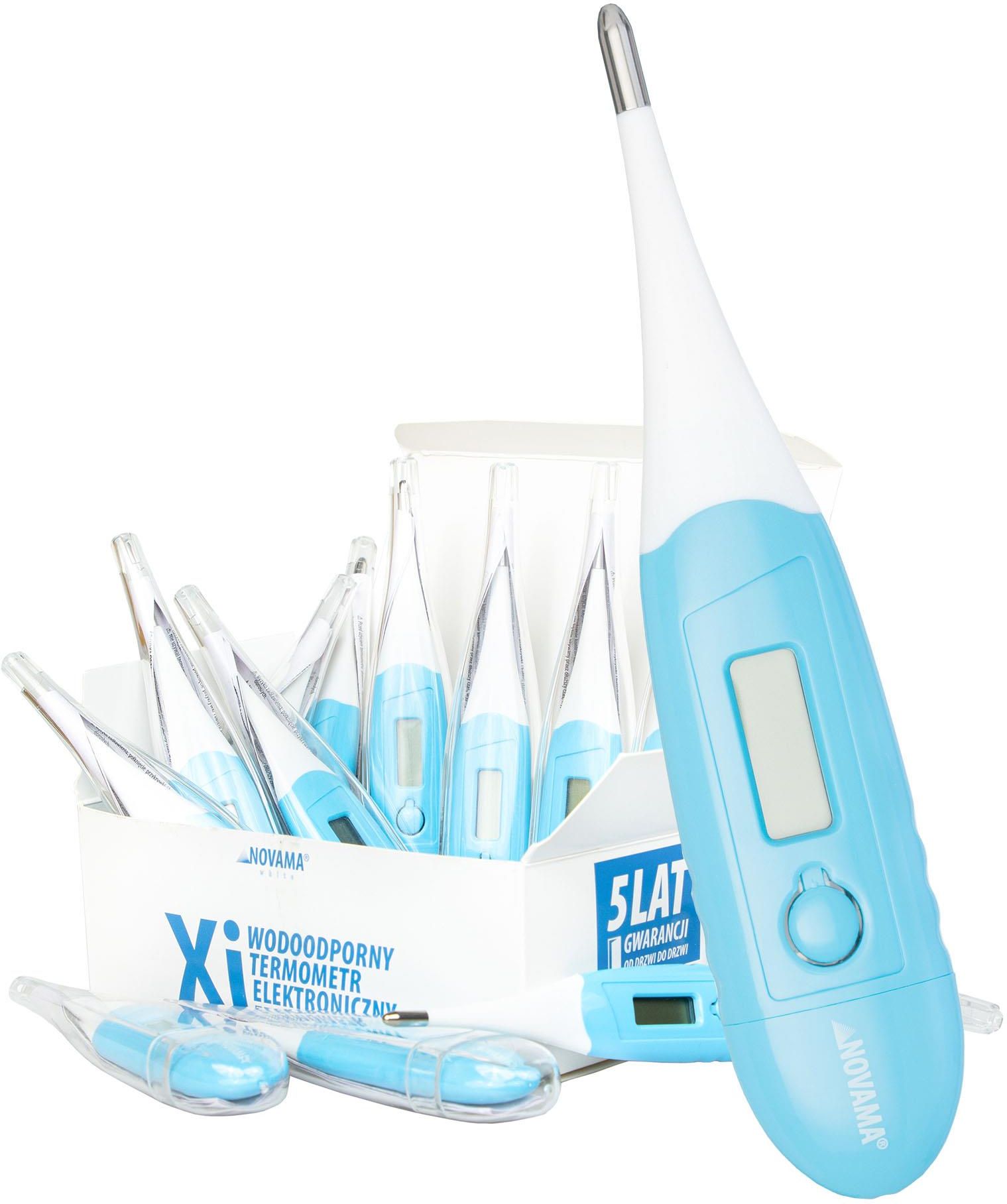 Wodoodporny termometr cyfrowy Novama White Xi Termometry rtęciowe odchodzą do lamusa, obecnie najpopularniejszym sposobem pomiaru temperatury jest termometr elektroniczny. Dokładny pomiar oraz łatwość obsługi charakteryzuje termometr elektroniczny Novama White Xi. Termometr elektroniczny służy do wykonywania pomiaru temperatury ciała. Pomiaru można dokonywać pod pachą, w ustach bądź rektalnie. Wiarygodny i wszechstronny termometr Novama White Xi Parametry termometru elektronicznego sprawiają, że jest to wiarygodny oraz dokładny przyrząd do mierzenia temperatury. Termometr posiada miękką końcówkę, która nie powoduje dyskomfortu np. u dziecka. Przyrząd szybko pokazuje wynik pomiaru (sygnał dźwiękowy), a także zapamiętuje wynik ostatniego pomiaru. Urządzenie jest wodoodporne, ma czytelny wyświetlacz oraz automatyczny wyłącznik. Plastikowe etui umożliwia bezpieczne przechowywanie. Czas pomiaru temperatury: 10 sekund; Dokładność pomiaru 0,01 (Pozwala na używanie tego termometru również jak termometru owulacyjnego); Zakres pomiaru: 32- 42,9 °C; Wymiary: 12,4 x 2,4 x 1,2 cm; Waga: 12 gr z baterią; Pamięć ostatniego wyniku; Sygnał dźwiękowy dokonania pomiaru; Sygnał dźwiękowy zbyt wysokiej temperatury; Automatyczne wyłączanie po 10 minutach bezczynności; Etui ochronne w zestawie; Termometr wyświetla na ekranie konieczność wymiany rozładowanej baterii.