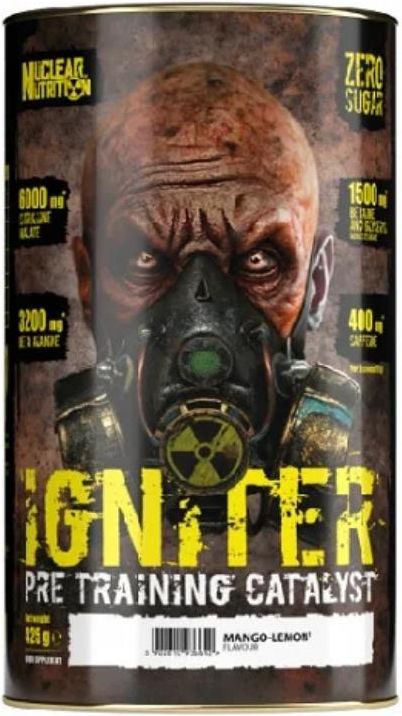 Nuclear Igniter 438g Przedtreningówka Owocowy Nuclear Igniter 438g Przedtreningówka Nuclear Igniter przeznaczony dla osób aktywnych fizycznie, które chcą zwiększyć swoją energię, siłę i wytrzymałość podczas treningu. Składniki aktywne zawarte w Nuclear Igniter mogą mieć następujące działanie: Jabłczan cytruliny: zwiększa poziom argininy w organizmie, która następnie przekształcana jest w tlenek azotu. Tlenek azotu rozkurcza naczynia krwionośne, co poprawia przepływ krwi do mięśni. Dzięki temu mięśnie otrzymują więcej tlenu i składników odżywczych, co pozwala na ich lepsze wykorzystanie podczas treningu. Beta alanina: zwiększa poziom karnozyny w mięśniach. Karnozyna jest związkiem, który chroni mięśnie przed kwasem mlekowym. Dzięki temu mięśnie mogą pracować dłużej i wydajniej przed wystąpieniem zmęczenia. Alfa-ketoglutaran L-argininy (AAKG): zwiększa poziom argininy i tlenku azotu w organizmie. Działanie AAKG jest podobne do działania jabłczanu cytruliny. Betaina bezwodna: jest związkiem, który pomaga zwiększyć wytrzymałość mięśni. Kofeina: jest pobudzającym środkiem, który zwiększa poziom energii i poprawia koncentrację. Dawkwoanie Zmieszać ~1 miarkę proszku (8,75 g) z 150-200 ml wody. Wypić jedną porcję rano oraz jedną porcję 30 minut przed treningiem. Nuclear Igniter przeznaczony dla osób aktywnych fizycznie, które chcą zwiększyć swoją energię, siłę i wytrzymałość podczas treningu. Składniki: Porcja (4,38 g) Jabłczan Cytruliny: 1500 mg W tym cytrulina: 1000 mg Beta-Alanina: 800 mg Alfa-ketoglutaran L-argininy: 500 mg w tym L-arginina: 350 mg Betaina: 375 mg Monostearynian glicerolu: 375 mg Kofeina: 100 mg
