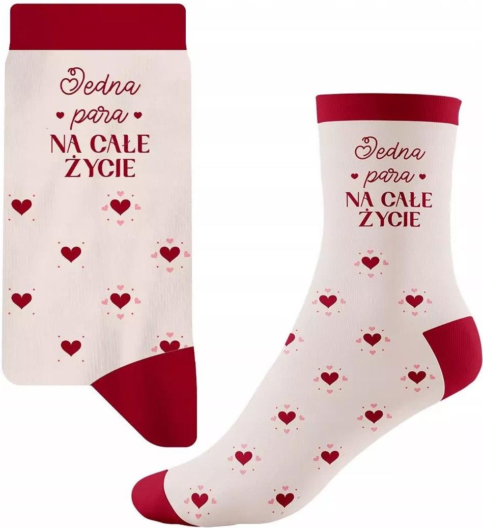 "Skarpetki walentynkowe dla ukochanej - Jedna Para na Całe Życie Romantyczny i zabawny upominek dla ukochanej. Białe skarpetki ozdobione czerwonymi serduszkami oraz napisem ""Jedna Para na Całe Życie"" to symboliczny prezent, który wywoła uśmiech i ciepło w sercu. Wykonane z przewagą naturalnej bawełny, są miękkie, wygodne i przewiewne, dzięki czemu świetnie sprawdzą się zarówno na chłodniejsze dni, jak i do noszenia na co dzień. Elastyczny materiał zapewnia komfort i idealne dopasowanie do stopy w rozmiarach 36-41. Skarpetki zostały wyprodukowane w Polsce z dbałością o jakość i detale. " Format: 89x180 mm