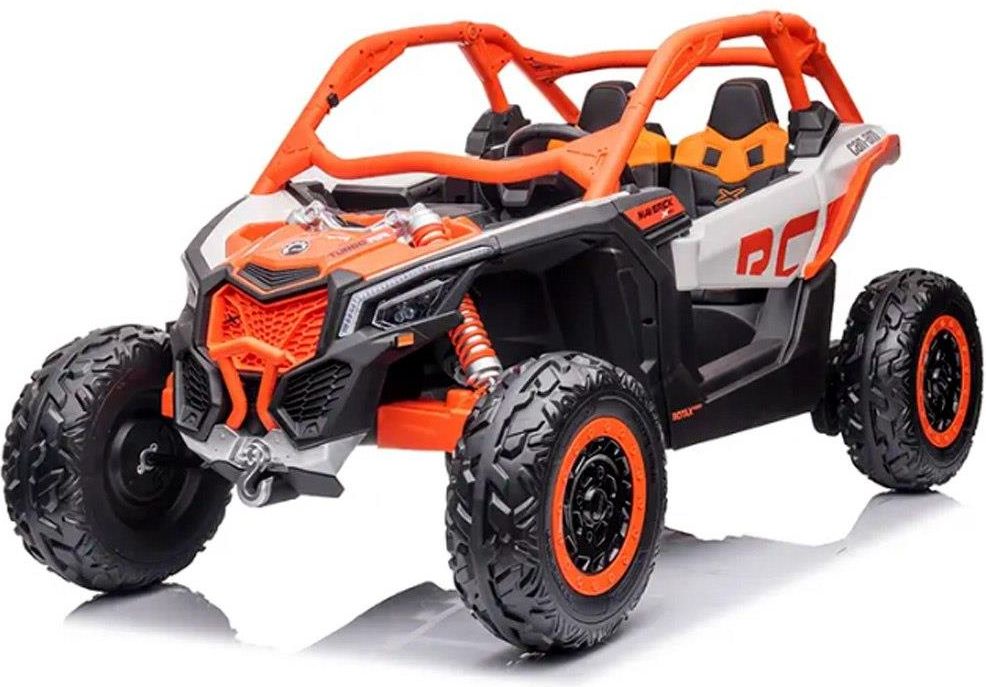 2os Buggy Can-am Maverick terenowy pojazd (pomarańczowe) PA0287 Terenowe dwu osobowe BUGGY Maverick Can-am to totalna nowość tego roku dla każdego małego kierowcy. Sportowe buggy to dwuosobowy pojazd z wygodnym fotelem i komfortowym zawieszeniem, który dowiedzie wszędzie tam gdzie potrzeba. Napęd na 4 silniki oraz amortyzatory i miękkie, piankowe koła pozwolą na komfortową, terenową jazdę. Dwuosobowy terenowy pojazd o napędzie 4 x silnik (4 x 24V - 200W) + akumulator (1 x 24V/7Ah) + pilot dla rodzica 2,4 HGz. Pojazd terenowy dla dzieci wykonany jest w całości z mocnego plastiku. Zadbano w nim o najdrobniejsze szczegóły typu pasy bezpieczeństwa, otwierane drzwi, pilot dla rodzica, efekty muzyczne, świetlne. Pojazdem można sterować za pomocą pilota, lub gdy dziecko pozna już zasady jazdy może sterować autkiem samodzielnie. Koła autka wykonane są z miękkiego tworzywa EVA, które zapewnią komfortową jazdę samochodem po nierównym podłożu. Dzięki napędowi 4x4 pojazd bez problemu poradzi sobie z pagórkami, nierównościami czy trawą. Wolny start zapewnia płynne ruszenie bez efektu szarpania samochodem. Samochód pomieści niezbędne akcesoria potrzebne podczas podróży. Moduł muzyczny z wgranymi wesołymi piosenkami zapewni wesołą jazdę. Dzięki panelowi muzycznemu kierowca może wybrać opcje słuchania wgranej muzyki lub własnych utworów z MP3. Pojazd przeznaczony dla najmłodszych pociech, świetnie sprawdzi się jako prezent urodzinowy lub na inną okazję. Specyfikacja: - pojazd odpalany za pomocą podświetlanego przycisku Start/stop (uruchamia odgłos silnika) - lewarek do zmiany kierunku jazdy przód/tył - włącznik/ wyłącznik świateł - przycisk w zabezpieczeniu do zmiany opcji sterowania pojazdem manual/RC - panel muzyczny zawierający: wgrane wesołe piosenki, wejście na USB, mini kartę SD, MP3, - oświetlenie diodowe przód + tył - miękkie koła EVA - pasy bezpieczeństwa - wygodny dwuosobowy fotel