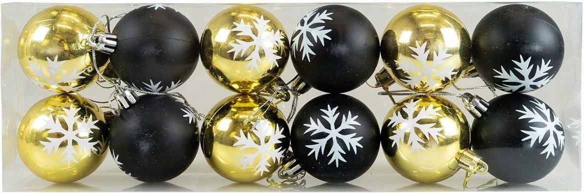 BOMBKI MIX BOX 12 SZT. 5 CM Zestaw bombek w dwóch kolorach to praktyczna i stylowa propozycja dla osób ceniących wygodę i elegancjęW komplecie znajduje się 12 bombek o średnicy 5 cm, zapakowanych w estetyczne pudełko, które ułatwia przechowywanie i przeznaczone jest również do wręczenia w formie upominkuBombki utrzymane są w kolorze złota i czerni z nadrukiem białych śnieżyk, dzięki czemu pasują zarówno do nowoczesnej choinki jak i klasycznych aranżacji świątecznychWielkość: 5 cmIlość: 12 szt. w pudełkuKolor: czerń i złoto z nadrukiem białych śnieżynekPakowanie: transparentne pudełko
