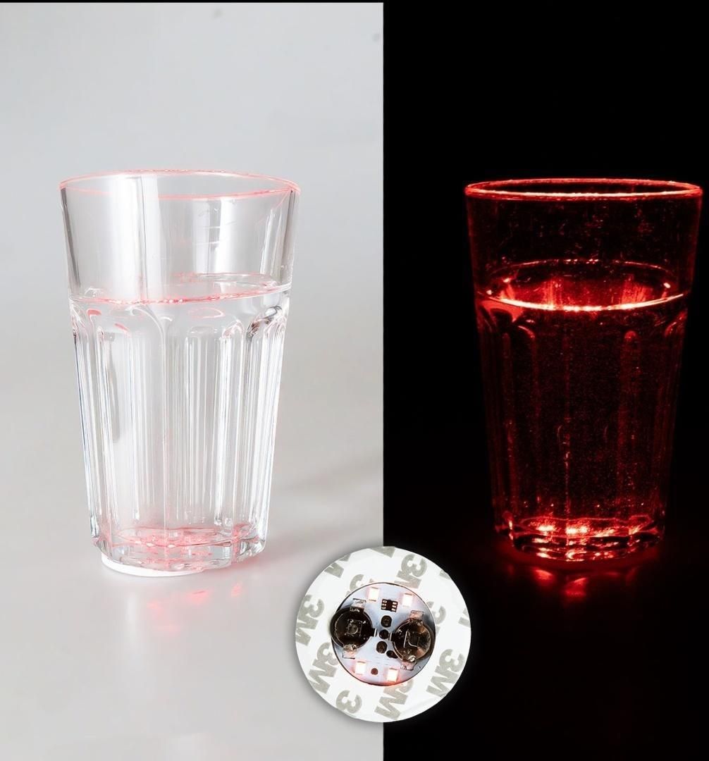 Podświetlenie LED - Naklejka do szklanki lub butelki (2 szt.) Średnica: 5 cm Ilość w zestawie: 2 sztuki Podświetlenie LED w formie naklejki to efektowny gadżet, który zmienia zwykłą szklankę, kieliszek lub butelkę w świecący element dekoracyjny. Po przyklejeniu do dna naczynia i włączeniu, diody …