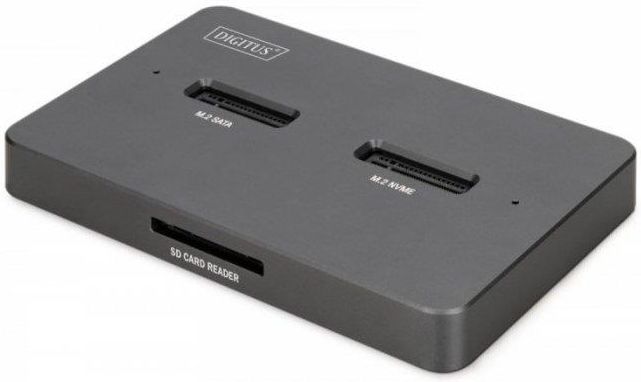 Stacja dokująca USB-C 3.2 Gen2 dla dysków SSD M.2 Duo NVMe oraz SATA (max. 2x 4 TB) z czytnikiem kart SD-Express 7.1 (max. 2 TB), czarna Zarządzanie dyskami SSD M.2 NVMe i M.2 SATA przez złącze USB-C - w tym zintegrowany czytnik kart SD Express Stacja dokująca 3 w 1 od DIGITUS może pomieścić dyski …