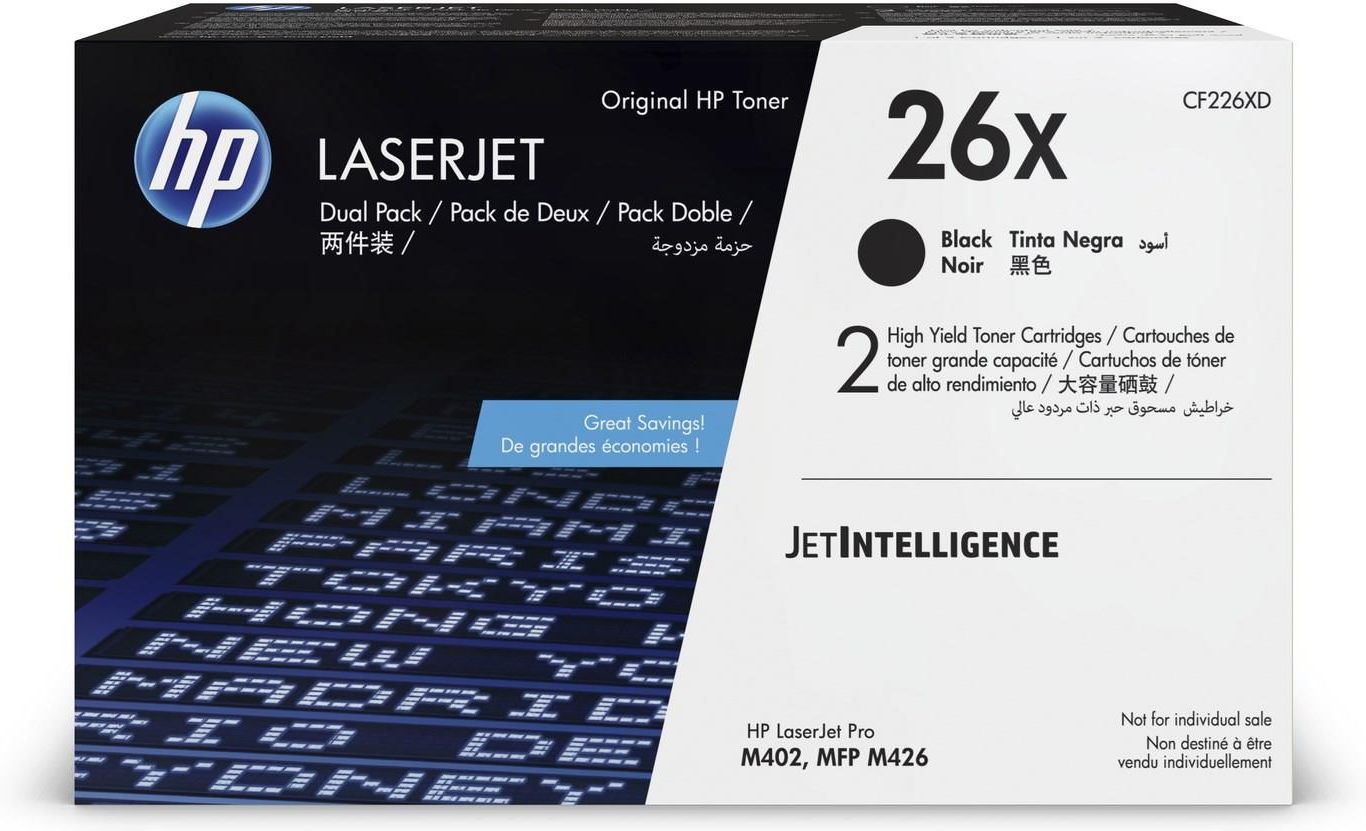 HP 26X 2-pack High Yield Black Original LaserJet Toner Cartridges with JetIntelligenceTen wysokiej jakości produkt HP No. 26X jest idealnym rozwiązaniem dla osób poszukujących niezawodnych i trwałych materiałów eksploatacyjnych. Pozwala na uzyskiwanie wysokiej jakości wydruków, mając jednocześnie pewność, że korzystamy z oryginalnego produktu od renomowanego producenta.Tonery HP CF226XD charakteryzuje się nie tylko doskonałą wydajnością, ale również prostotą obsługi. Dzięki indywidualnemu opakowaniu niezawodne produkty HP są łatwe w montażu i demontażu, co przekłada się na wygodę użytkowania. Produkty HP mają szerokie zastosowanie w domach, biurach i kancelariach, a ich wysoka jakość gwarantuje zadowolenie klientów.Dodatkowo, HP CF226XD 26X to produkt ekologiczny, który spełnia najwyższe standardy pod względem ochrony środowiska. Biorąc pod uwagę zmieniające się wymagania w zakresie zrównoważonego rozwoju, wybierając nasz oryginalny produkt HP, przyczyniasz się do ograniczenia produkcji odpadów, a tym samym chronisz środowisko naturalne. Specyfikacja HP LaserJet Pro M402d (C5F92A) HP LaserJet Pro M402n (C5F93A) HP LaserJet Pro M402dn (C5F94A) HP LaserJet Pro M402dw (C5F95A) HP LaserJet Pro M402dne (C5J91A) … Jak mierzona jest wydajność wkładów drukujących? Od 2006 roku wiodący producenci urządzeń drukujących wraz z organizacją certyfikującą ISO opracowali wspólny zunifikowany system pomiaru wydajności laserowych i atramentowych wkładów drukujących. Opracowane normy ISO 19752, ISO 19798, ISO 24711 oraz ISO 24712 dokładnie określają warunki testowe oraz metodologię badania wydajności. Z uwagi na to, że test wydajności ISO jest przeprowadzany w ściśle kontrolowanych warunkach, użytkownik ma niewielkie szanse, by w codziennym korzystaniu z drukarki odtworzyć identyczne warunki i parametry eksploatacyjne, jakich wymaga norma pomiaru ISO. W efekcie codziennej pracy rzeczywista wydajność zakupionego wkładu może znacznie odbiegać od deklarowanej przez producenta. Czynniki takie jak pokrycie strony, ustawienia jakości druku, czyszczenie głowicy atramentowej, typ nośnika, warunki otoczenia, drukowanie dwustronne, mogą spowodować dużo wyższe zużycie ładunku barwiącego wkładu atramentowego lub laserowego.