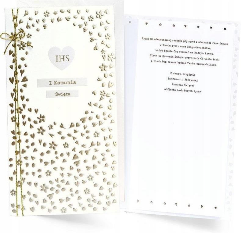 Karnet Komunia Autor: Kukartka EAN: 5901924497714 SID: 3465023 Karnet Komunia Każda kartka w kolekcji Passion Moments to małe arcydzieło - wyjątkowe i niepowtarzalne, piękne wizualnie. Kartki PM są bardzo bogato zdobione, a jednocześnie skromne i stylowe, cały efekt tkwi w detalach i doskonałym wykonaniu. W zależności od wzoru, na kartkach znajdują się dekoracje ze złotej, srebrnej, perłowej lub holograficznej folii, a także doklejki biżuteryjne, kokardki, laserowe wycięcia, wstążeczki i inne dodatki. Wnętrze karnetu to zawsze atrakcyjna grafika i tekst życzeń. Kartki mają w komplecie dopasowaną kopertę. Cechy szczególne: zdobienie: przynajmniej dwie folie (metaliczne/perłowe/holograficzne), elementy doklejane, wycięcia laserowe, wstążeczki - w zależności od wzoru, wnętrze: z delikatną grafiką, wyjątkowe życzenia w środku, w komplecie: dopasowana kolorystycznie koperta, okazja: komunia Wymiary karnetu po złożeniu: 11,4 x 21,5 cm.