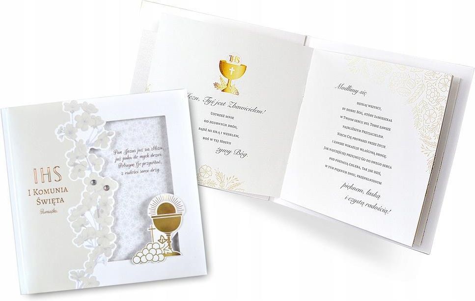 Pamiątka Pierwszej Komunii Świętej - Książeczka Passion Moments Books Q PMB Q-0006 Książeczki PMB Q to produkt wyjątkowy - pięknie wydany, elegancki, zdobiony złotą oraz perłową folią, z kolorowym wnętrzem z pięknymi grafikami i cytatami oraz życzeniami i miejscem na osobistą dedykację. Na wewnętrznej stronie okładki wklejona jest specjalna, nieduża koperta, w której można przekazać kartę podarunkową lub banknot. Książeczka PMB Q Kukartka to idealny prezent na wyjątkową okazję, jaką niewątpliwie jest Pierwsza Komunia Święta. Cechy szczególne: Format: 20 x20 cm zdobienie: złota oraz perłowa folia wnętrze: kolorowe, z grafikami, cytaty, miejsce na dedykację i wpisanie miejsca/godziny uroczystości, gratis: koperta na drobny upominek wewnątrz, okazja: komunia, Pierwsza Komunia Święta. Rok wydania: 2024 Oprawa: folia Format: 207x207 mm