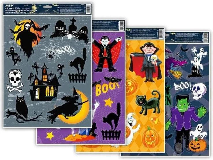 Folia okienna bez kleju z motywami halloween.Sposób użycia:Obrazek odkleić od podłoża i umieścić na czystej, ewentualnie zwilżonej szybie stroną, która byłą przyczepiona do podłoża. Obrazek przylgnie elektrostatycznie.