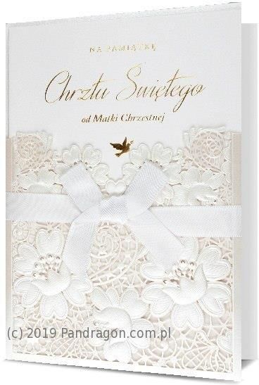 Na pamiątka Chrztu Świętego od Matki Chrzestnej - kartka HM100-972 Piękna kartka na chrzest święty wykonana na papierze ozdobnym – prezent od matki chrzestnej Kartka składana, wykończona delikatnie folią metalizowaną, z naklejanymi elementami i wycięciami laserowymi, w zestawie z kopertą ozdobną. Wymiary kartki: 13 x 18 cm Treść życzeń wewnątrz kartki: Niech Bóg Cię błogosławi, niech przy Tobie trwa, niechaj będzie Bożym dziełem każda chwila Twa! Z okazji przyjęcia Sakramentu Chrztu Świętego z najlepszymi życzeniami. Tytuł: Na pamiątka Chrztu Świętego od Matki Chrzestnej - kartka HM100-972 Język: polski Rodzaj towaru: kartka EAN: 5901854953281 Producent: Pan Dragon Wymiary: 135x190 mm