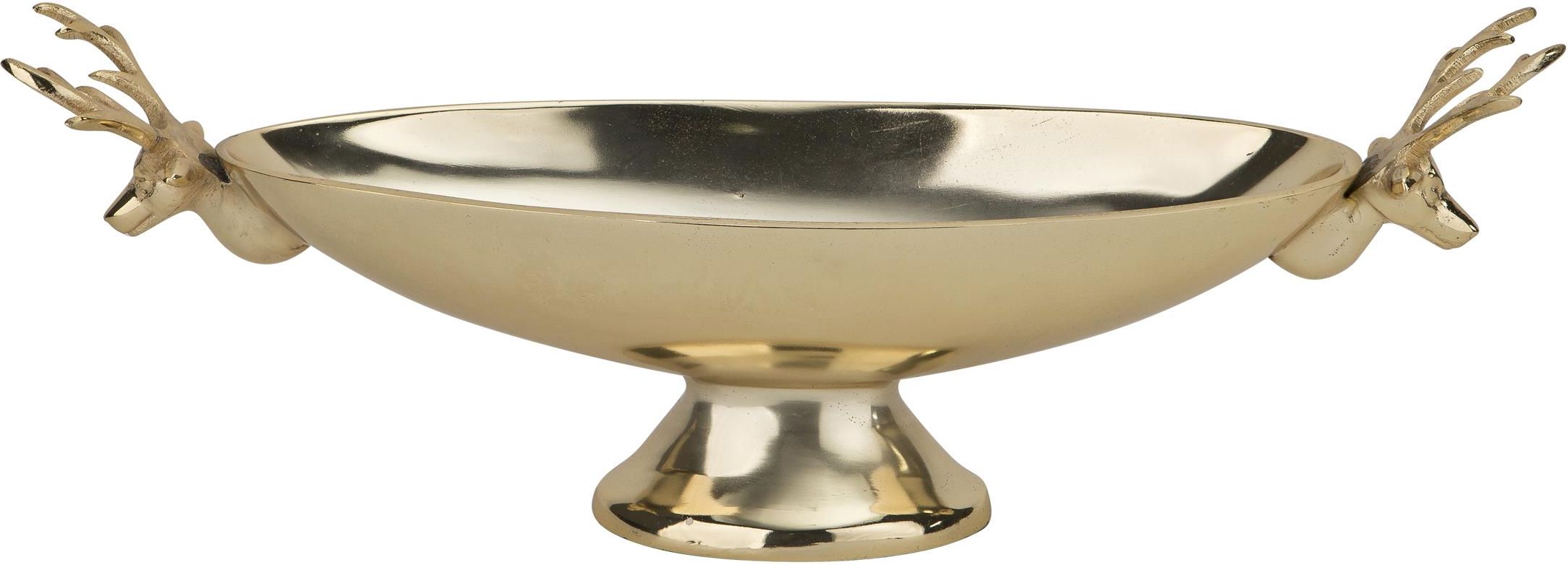 Patera dekoracyjna z Reniferami złota metalowa 34 cm Elegancka patera dekoracyjna w kolorze złota. Pięknie zdobiona. Wytworzona z dbałością o szczegóły. Posiada efektowne uchwyty w kształcie głów Reniferów. Niezwykle dostojna kompozycja, której uroku dodaje podwyższona podstawa i wysoki połysk. …