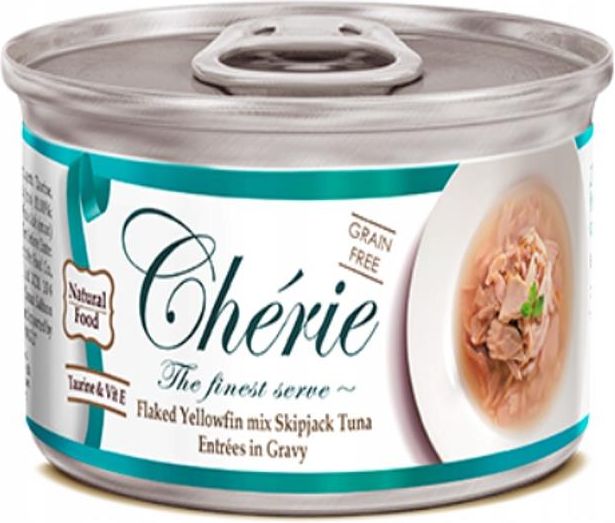 Karma uzupełniająca dla kotów. Miks smażonego tuńczyka żółtego i dzikiego. Podawane w specjalnym gęstym sosie Chérie. Autorski przepis szefów kuchni, który zawiera delikatne kawałki świeżych owoców morza. Pyszna mieszanka tuńczyka w sosie to apetyczna przystawka dla Twojego mruczka. Naturalny smak i smakowity sos Chérie to luksusowe doznania smakowe dla kotów. Każdy autorski przepis zawiera delikatne kawałki naturalnych owoców morza w pysznym sosie. Dlaczego warto wybrać karmę mokra dla kota Cherie? 100% składników pochodzenia naturalnego - Tylko naturalne składniki. Pokarm wyłowiony prosto z oceanu. Bez chemikaliów, produktów ubocznych i wypełniaczy 2-godzinna kontrola świeżości - Od procesu oczyszczania do zapakowania produktu mijają zaledwie 2 godziny, co pomaga zachować świeżość produktu i sprawia, że jest to najsmaczniejsza karma dla zwierząt domowych. Gotowanie na parze - Najlepszy i najzdrowszy sposób gotowania mięsa i owoców morza pozwalający zachować naturalne składniki odżywcze. Pomoc w trawieniu - Dzięki połączeniu naturalnych włókien mięsnych zapobiega powstawaniu kul włosowych. Zawiera inulinę i fruktooligosacharydy, które pomagają poprawić trawienie. Bez zbóż - Nie zawiera zbóż, pszenicy, kukurydzy, soi i glutenu. Bez dodatku sztucznych składników, konserwantów i kolorantów. Skład: woda, tuńczyk 42,9% Dodatki: modyfikowana skrobia z tapioki, guma guar, Dodatki technologiczne: Witaminy, pro-witaminy i chemicznie dobrze zdefiniowane substancje o podobnym działaniu: Witamina E50 IU/kg, Tauryna 98,5 mg/kg. SKŁAD ANALITYCZNY: Białko surowe (min) 13,00%; Oleje i tłuszcze surowe (min) 0,40%; Włókno surowe (maks.) 0,10%; Popiół surowy (maks.) 1,00%; Wilgotność (maks.) 84,00%. Energia Metaboliczna 53 kcal/100g.