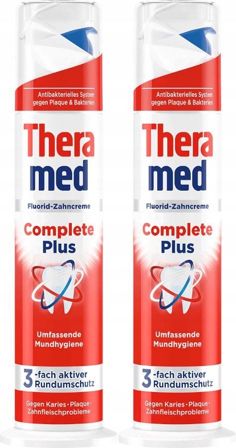 OFERTA SPECJALNA Przy złożeniu zamówienia od 80 zł otrzymacie w prezencie pastę Colgate Max White travel edition 20 ml (oszczędzacie 8 zł), a przy złożeniu zamówienia od 100 zł otrzymacie kolejną pastę Colgate Max White 20 ml (oszczędzacie 16 zł). 2x Pasta do zębów w tubie Theramed Complete Plus 100ml Theramed Complete Plus to pasta do zębów najwyższej jakości, stworzona z myślą o kompleksowej pielęgnacji jamy ustnej. Zapakowana w praktyczną tubkę, pasta zapewnia skuteczne oczyszczanie zębów oraz długotrwałą ochronę przed różnorodnymi problemami stomatologicznymi. 3-fazowa ochrona Przeciwdziałanie próchnicy: Specjalna formuła z fluorem skutecznie zapobiega próchnicy, wspomagając remineralizację szkliwa i zapewniając zdrowe zęby. Ochrona przed problemami dziąseł: Regularne stosowanie pasty eliminuje płytkę bakteryjną, która często prowadzi do problemów z dziąsłami, takich jak paradontoza. Zapobieganie powstawaniu płytki i kamienia nazębnego: Dzienna aplikacja pasty redukuje tworzenie się płytki nazębnej, co skutecznie zapobiega powstawaniu kamienia nazębnego i zapewnia zdrową jamę ustną. Cechy pasty Theramed Complete Plus Skuteczne usuwanie osadu z zębów: Pasta efektywnie usuwa osady z zębów, zapewniając uczucie idealnej czystości. Zapewnienie długotrwałego odświeżenia oddechu: Pasta neutralizuje nieprzyjemny zapach z ust, zapewniając uczucie świeżości przez długi czas. Praktyczne i ergonomiczne opakowanie: Pasta jest zapakowana w tubkę, która umożliwia łatwe i szybkie dawkowanie, dbając jednocześnie o higienę i czystość użytkowania. Wygoda użytkowania Theramed Complete Plus został zaprojektowany z myślą o wygodzie użytkowników. Ergonomiczne opakowanie pozwala na łatwe i precyzyjne dozowanie pasty, co czyni codzienną pielęgnację jamy ustnej prostszą i bardziej wygodną. Regularne stosowanie pasty zapewnia długotrwałą ochronę i kompleksową pielęgnację, pomagając utrzymać zdrowe zęby i dziąsła oraz świeży oddech przez cały dzień.