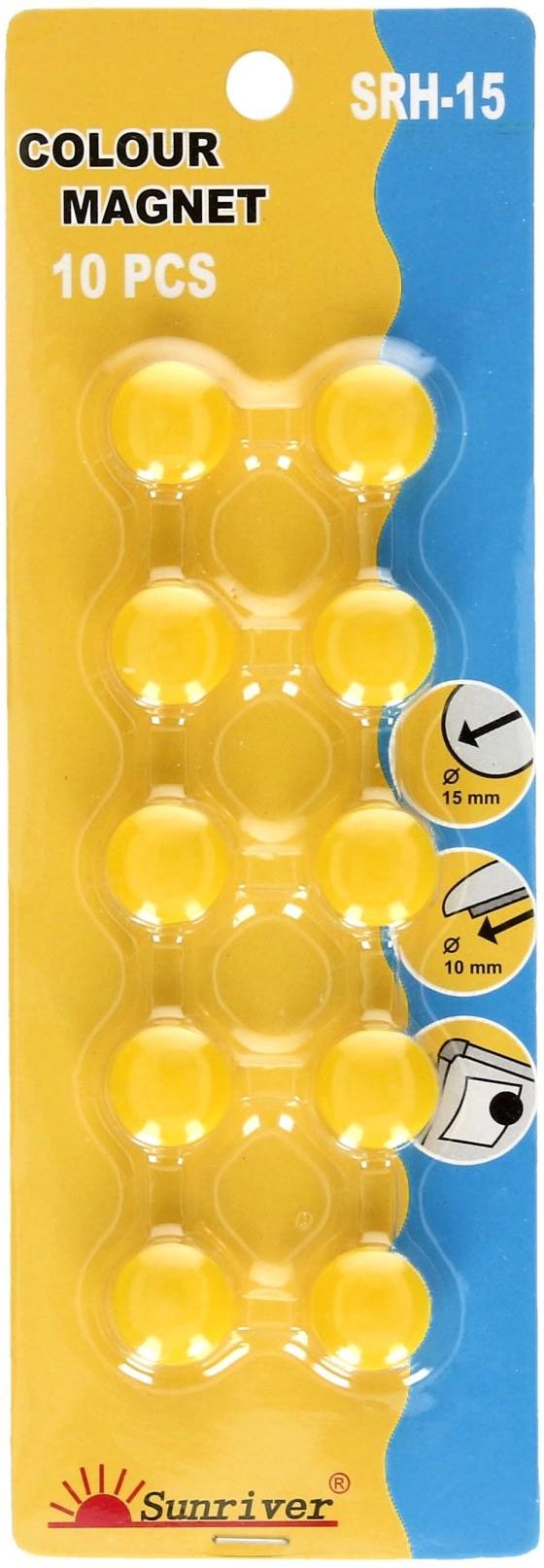 Żółte, okrągłe magnesy do tablic SRH-15. Zapakowane w blister z możliwością zawieszenia. Popularny sposó na mocowanie arkuszy papieru do tablic magnetycznych. Kolor: żółty Kształt: koło Średnica: 15mm Ilość: 10 szt.