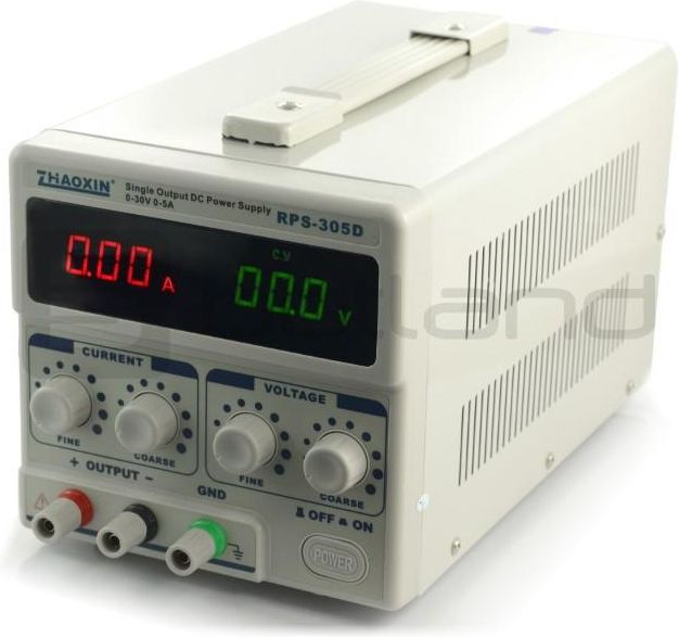 Zasilacz laboratoryjny RPS-305D Parametry techniczne zasilacza RPS-305D napięcie wyjściowe regulowane: 0-30V płynna regulacja prądu wyjściowego: 0-5A prąd wyjściowy: 0-5A temperatura pracy: -10°C – 40°C wilgotność: <90% dokładność wskazań woltomierza: ± (1%+1cyfra) dokładność wskazań amperomierza: ± (1%+1cyfra) współczynnik stabilizacji napięcia CV:≤0.01% + 2mV tętnienia i szumy napięcia: ≤1 mVrms stabilizacja prądu: ≤0.2% + 3mA tętnienia i szumy prądu: ≤2 mArms napięcia zasilania: 220V AC ±10%, 50Hz wymiary zewnętrzne: 278x160x170mm waga: 4,62kg RPS-305D to zasilacz laboratoryjny o regulowanym napięciu wyjściowym od 0 do 30V. Maksymalna wydajność prądowa to 5A. Zasilacz posiada duży i czytelny wyświetlacz LED 3,5 cyfry z podświetleniem na którym wyświetlany jest aktualnie płynący prąd oraz wartość ustawionego napięcia. Solidna metalowa obudowa. Idealnie nadają się do pracach naukowych, laboratorium, prac serwisowych oraz domowego warsztatu. Konstrukcja zasilacza oparta na solidnym transformatorze (zasilacz liniowy) przystosowanym do pracy ciągłej. Charakterystyka RPS-305D płynna regulacja napięcia wyjściowego: 0-30V płynna regulacja prądu wyjściowego w zakresie: 0-5A wydajność prądowa do 5A jednoczesny odczyt napięcia i płynącego prądu na wyjściu wyświetlacz LED woltomierz: wyświetlacz LED 3,5 cyfry o rozdzielczości 0,1V amperomierz: wyświetlacz LED 3,5 cyfry o rozdzielczości 0,01A praca w trybie C.V. (Constant Voltage -stabilizacja napięcia wyjściowego) praca w trybie C.C. (Constant Current - stabilizacja prądu wyjściowego) zasilacz liniowy (na transformatorze) przystosowany do pracy ciągłej niezawodny stosunkowo małe wymiary zewnętrzne wygodna gumowa rączka do przenoszenia chłodzenie aktywne za pomocą wbudowanego wentylatora (wymuszony obieg powietrza) wentylator połączony z czujnikiem temperatury (uruchomienie wentylatora następuję dopiero gdy pobierany jest większy prąd - po nagrzaniu się radiatora) Zestaw zawiera zasilacz RPS-305D kabel sieciowy oryginalne opakowanie karton uniwersalny przewód pomiarowy ->
