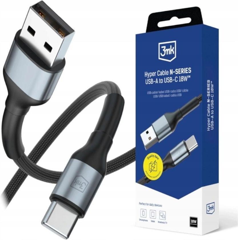 Czarny Kabel 3mk Hyper Cable N-SERIES A to C 1m 9V/2A 18W do iPhone Samsung Uniwersalna kompatybilność Połączenie klasycznego portu USB-A z nowoczesnym USB-C pozwala bezproblemowo ładować i synchronizować zarówno starsze, jak i najnowsze urządzenia. USB-A zapewnia zgodność z milionami ładowarek, powerbanków i komputerów, a USB-C obsługuje szybkie ładowanie smartfonów i tabletów. Quick Charge 3.0 automatycznie dostosowuje moc, gwarantując szybkie i bezpieczne ładowanie. Wzmocniona konstrukcja z nylonowym oplotem i aluminiowe końcówki premium zapewniają trwałość i elegancki wygląd w każdym otoczeniu. Zestaw zawiera 3mk Hyper Cable N-SERIES USB-A to USB-C 18W™, instrukcja obsługi, opakowanie. Przemyślana długość dla pełnej wygody Jeden metr to idealna długość do codziennego użytku – wystarczająco długa, by swobodnie podłączyć urządzenia przy biurku, w samochodzie czy w podróży, a jednocześnie na tyle krótka, by uniknąć plątaniny kabli. To praktyczne rozwiązanie zapewnia komfort, porządek i łatwość korzystania z urządzeń w każdym miejscu. Minimalistyczny design Klasyczna czerń w połączeniu z premium wykończeniem sprawia, że kabel idealnie pasuje do każdego urządzenia. Solidny nylonowy oplot zwiększa wytrzymałość przewodu, a jednocześnie nadaje mu elegancki, profesjonalny wygląd. To połączenie stylu i funkcjonalności sprawia, że kabel doskonale sprawdzi się zarówno w domu, biurze, jak i w podróży. Wzmocniona konstrukcja Kabel Hyper Cable N-SERIES został zaprojektowany tak, aby wytrzymać codzienne, intensywne użytkowanie. W newralgicznych miejscach zastosowano solidne wzmocnienia, które chronią wnętrze kabla przed uszkodzeniami i naprężeniami powstającymi przy zginaniu czy częstym podłączaniu. Dodatkowo specjalne wzmocnienia przy końcówkach minimalizują ryzyko pęknięć, dzięki czemu kabel pozostaje trwały i niezawodny przez długi czas, niezależnie od tego, gdzie i jak go używasz – w domu, biurze czy w podróży. Nieplączący oplot nylonowy Solidny, nylonowy oplot zapewnia wyjątkową trwałość i estetyczny wygląd. Jest odporny na przetarcia i mikrouszkodzenia, a jednocześnie nie plącze się podczas codziennego użytkowania. Dzięki elastyczności splot układa się łatwo do pracy, a zwinięty zajmuje minimalną przestrzeń, zachowując elegancki wygląd nawet po długotrwałym użytkowaniu. Aluminiowe końcówki Końcówki wykonane z wysokogatunkowego aluminium zostały anodowane w celu zwiększenia odporności na zarysowania i korozję. Ergonomiczny kształt ułatwia chwyt i precyzyjne podłączanie, a metalowa obudowa wspomaga efektywne odprowadzanie ciepła, co zwiększa stabilność i bezpieczeństwo działania kabla w czasie ładowania lub transferu danych. Bezpieczny transfer danych i kompatybilność Hyper Cable N-SERIES zapewnia stabilny transfer danych zgodny ze standardem USB 2.0, minimalizując ryzyko zakłóceń i utraty informacji. Kabel jest uniwersalny i kompatybilny z szeroką gamą urządzeń: smartfonami, tabletami, laptopami, konsolami przenośnymi, powerbankami oraz akcesoriami smart home. Europejska jakość i certyfikaty Hyper Cable N-SERIES to produkt europejskiej marki, stworzony zgodnie z najwyższymi standardami jakości. Każdy kabel spełnia obowiązujące wymagania i posiada odpowiednie certyfikaty bezpieczeństwa, co gwarantuje niezawodność, trwałość i zgodność z normami.