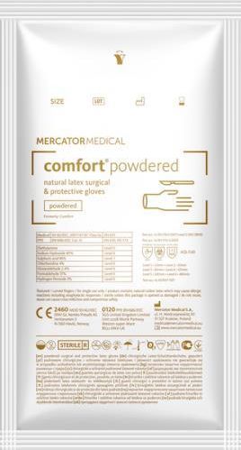 Rękawice chirurgiczne przeznaczone do procedur ogólnych, wykonane z naturalnego lateksu, pudrowane. comfort® powdered – rękawice chirurgiczne przeznaczone do procedur ogólnych, wykonane z naturalnego lateksu, pudrowane. Elastyczny materiał zapewnia dobre dopasowanie do dłoni i najwyższy komfort pracy. comfort® powdered EO to: Elastyczny materiał zapewnia dobre dopasowanie do dłoni i najwyższy komfort pracy. Specyfikacja: Typ produktu: medyczny Klasa medyczna: IIa Typ ochrony: III Marka: mercator Materiał: lateks Jałowość: jałowa Metoda sterylizacji: EO Tekstura: teksturowana Powierzchnia wewnętrzna: pudrowana Poziom szczelności AQL: 0.65 Kształt: anatomiczny Mankiet: rolowany Długość rękawicy: standardowa Grubość: rękawice standardowe Odpowiedni dla skóry wrażliwej: nie, rękawice lateksowe, pudrowane Normy i certyfikaty: Zgodność z normami: EN 420 MDD 93/42 EN ISO 15223-1 EN 1041 Rozporządzenie (UE) 2016/425 EN 455(1-4) EN 566 EN ISO 11737-1,2 EN ISO 11135-1 EN ISO 11138-2 EN ISO 13485:2016 EN ISO 14971 ISO 10993-1,5,7,10 EN ISO 374-1 EN ISO 374-2 EN ISO 374-4 EN ISO 374-5 EN 16523-1
