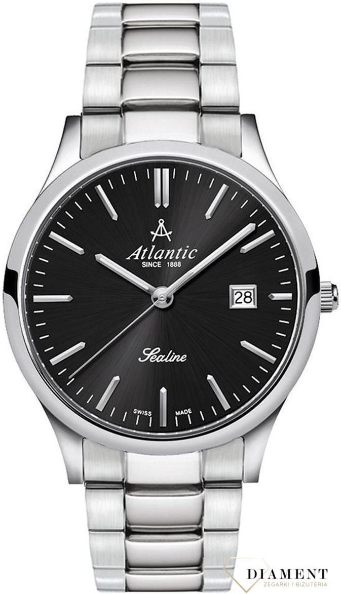 MECHANIZM: Zegarek męski Atlantic Sealine 62346.41.61 wyposażony jest w kwarcowy mechanizm, zasilany za pomocą baterii. Posiada bardzo wysoką dokładność mierzenia czasu +/- 10 sekund w przeciągu 30 dni. KOPERTA: Mechanizm szwajcarski mieści się w stalowej, wytrzymałej kopercie. Wykorzystanie wysokiej jakości stali w kopercie gwarantuje, że zegarek odporny jest na korozję i uszkodzenia oraz nie powoduje alergii. Stop stali szlachetnej charakteryzuje się optymalna odpornością na korozje. W zegarkach ATLANTIC wykorzystany jest jeden z najlepszych stopów stali 316L. SZKŁO: Zegarek wyposażony w szkło szafirowe, które oprócz niezwykłej twardości (stopień 9 w skali Mohsa) charakteryzuje się także odpornością na skrajne różnice temperaturowe i działanie rozpuszczalników. TARCZA: Tarcza zegarka w kolorze czarnym z wyraźnymi indeksami zapewnia przejrzysty i czytelny wygląd. BRANSOLETA: Wykorzystanie wysokiej jakości stali w bransolecie gwarantuje, że zegarek odporny jest na korozję i uszkodzenia oraz nie powoduje alergii. Stop stali szlachetnej charakteryzuje się optymalna odpornością na korozje. W zegarkach ATLANTIC wykorzystany jest jeden z najlepszych stopów stali 316L. ZAPIĘCIE: Standardowe zamknięcie na podwójny zatrzask gwarantuje posiadaczowi tego zegarka, że nie zsunie mu się z ręki nawet w momencie niechcącego otwarcia. Natomiast zamknięcie bransolety odbywa się przez zatrzaśnięcie. Na zapięciu widnieje eleganckie logo Atlantic z charakterystycznym logo. WODOSZCZELNOŚĆ: Zegarek z wodoszczelnością 30m (3 ATM), gwarantuje właścicielowi, że nie musi bać się zachlapań, czyli np. mycia rąk. DATOWNIK: Wygodny datownik umieszczony na tarczy ukazuje w formie popularnego okienka aktualny dzień miesiąca. Zegarki Atlantic Sealine Są to najbardziej klasyczne zegarki wykonane przy użyciu wysokiej klasy materiałów. Każdy z czasomierzy został wyposażony w szafirowe szkiełko, które jest niezwykle odporne na zarysowania. Koperty i bransolety zostały zrobione ze stali szlachetnej, a paski ze skóry wysokiej jakości. Zegarki Atlantic Seabase cieszą się ogromnym zainteresowaniem wśród konsumentów nie tylko dzięki użyciu wysokiej jakości materiałów, ale również niskiej cenie. Atlantic – jest to szwajcarska firma produkująca zegarki. Została założona w 1888 roku w szwajcarskiej miejscowości Bettlach przez Eduarda Kummera. Początkowo firma nosiła nazwę EKB- Eduard Kummer Bettlach , później zmienioną na Atlantic. Na początku swojej działalności firma zajmowała się produkcją podzespołów dla takich marek jak Certina czy Longines. W 1932 roku rozpoczęła produkcję własnych zegarków pod marką Atlantic. Ówcześnie były to, jedne z pierwszych na świecie zegarków wodoszczelnych. Firma "Atlantic" wynalazła mechanizm szybkiego przesuwu datownika za pomocą koronki. Najpopularniejszym kiedyś modelem zegarka "Atlantic" był Worldmaster. W Polsce zegarki Atlanic pojawiły się w 1950roku i szybko zaczęły cieszyć się dużym powodzeniem i już od 1965 zegarki tej firmy należały do najlepiej sprzedających się zegarków na naszym rynku. Jesteśmy AUTORYZOWANYM DYSTRYBUTOREM marki ATLANTIC. WSZYSTKIE SPRZEDAWANE ZEGARKI SĄ NOWE. Po zakupie otrzymujecie Państwo: • Oryginalnie zapakowany zegarek • Gwarancje (24 miesiące) • Paragon (faktura VAT)