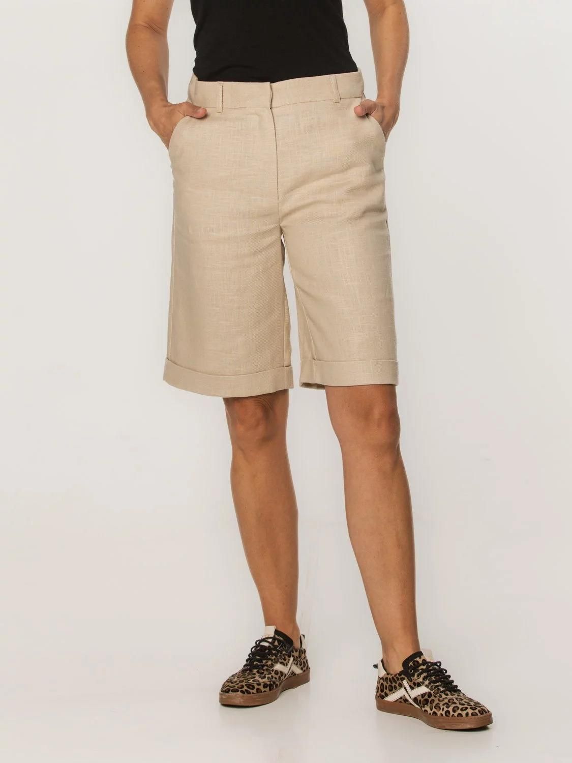 Szorty damskie z wysokim stanem Szorty z wysokim stanem, mankietami i szlufkami, dają możliwość ukrycia niedoskonałości sylwetki, optycznie podkreślają kobiece kształty oraz wydłużają sylwetkę. Naturalna tkanina z włókien ramii, posiada podobne właściwości do bawełny i lnu naturalnego, czyli trwałość i przewiewność. - Skład tkaniny: 70% ramia, 30% bawełna - Kolor główny: beżowe w delikatny prążek - Nogawki: szerokie, krótkie z mankietem - Kieszenie: dwie boczne, dwie tylne - Producent: Willsoor - Gwarancja: 24 m-ce