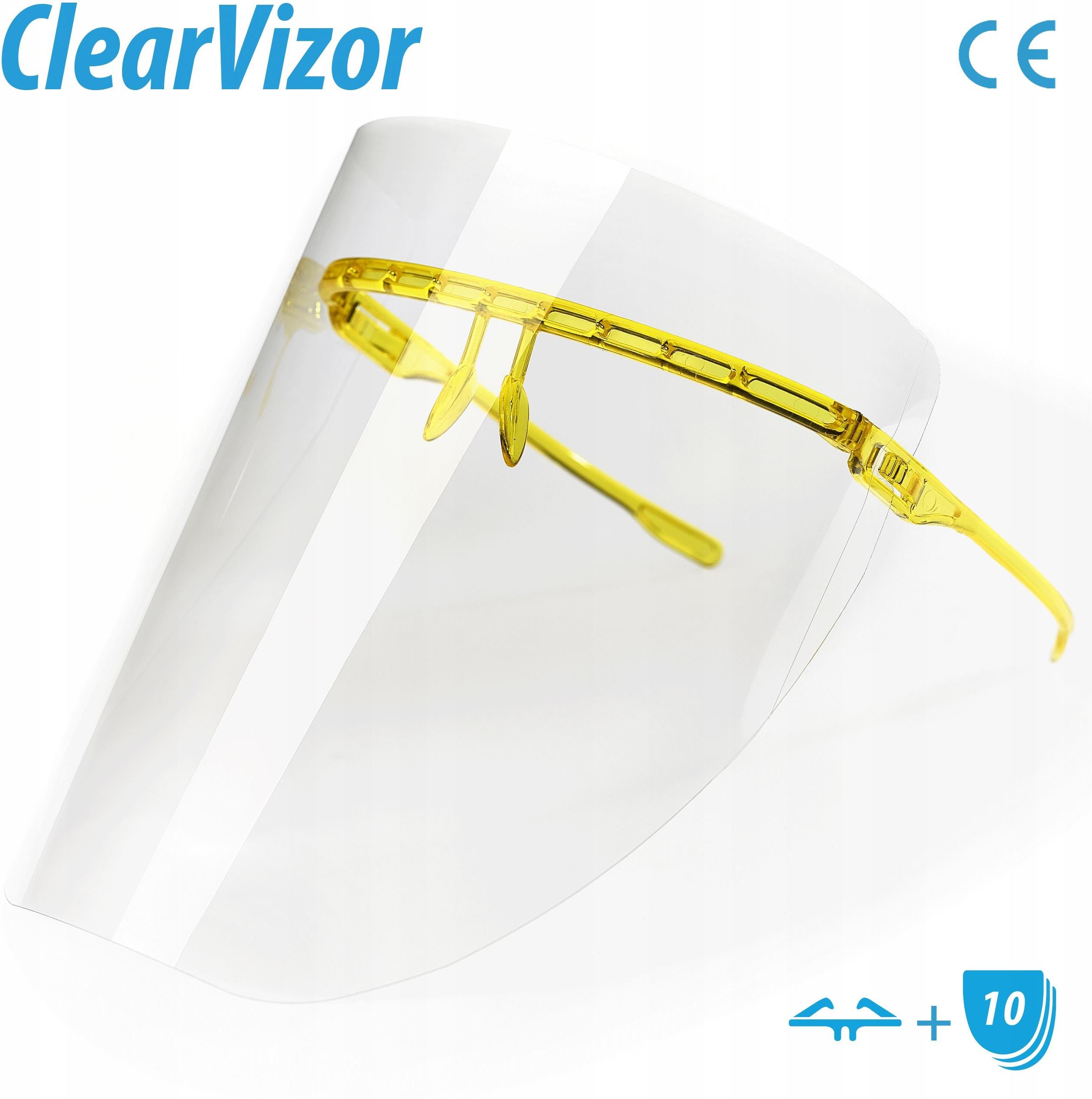 Przyłbica ochronna ClearVizor© - w zestawie oprawki w kolorze żółtym transparentnym (1 szt.) i folie ochronne wzór A1 (10 szt.). Najlżejsza i najbardziej komfortowa przyłbica na rynku. Z zamontowaną folią ochronną waży tylko 15 g. Oprawki ClearVizor© są wykonane z lekkiego, trwałego materiału. Ich konstrukcja umożliwia używanie z okularami optycznymi. Zintegrowane klipsy umożliwiają szybką wymianę folii ochronnych. Folie ochronne ClearVizor© są wykonane z cienkiego poliwęglanu o najwyższej możliwej jakości i przejrzystości. Są fabrycznie zabezpieczone obustronnie przed uszkodzeniem podczas transportu i przechowywania. Można je używać z większością dostępnych na rynku oprawek innych producentów. Do zastosowania w gabinetach stomatologicznych i kosmetycznych oraz w laboratoriach. Ich podstawowym zadaniem jest ochrona twarzy i oczu przed odpryskami, pyłem i chemią, ale nie bez znaczenia jest także zabezpieczenie przed czynnikami chorobotwórczymi przenoszonymi drogą kropelkową.