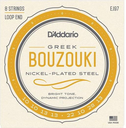 D'Addario's EJ97 strings are designed for use with 8-string Greek bouzoukis of various scales. The unwound strings are made from plain steel and the wound strings are nickel wound. D'Addario offers a wide variety of ethnic instrument strings designed to the exacting specifications of our artists, instrument parterns and international customers. Our computer-controlled winding machinery, laser micrometer inspection, and closed-loop tension control systems promise unrivaled quality and consistency, set after set. Designed for use with 8-string Greek bouzoukis of various scales Distinctive bright tone and excellent intonation Environmentally friendly, corrosion resistant packaging for strings that are always fresh Made in the U.S.A. for the highest quality and performance String Gauges: Plain Steel .010, .010, .013, .013, Nickelplated Steel Wound .022, .010(p), .028, .013(p)