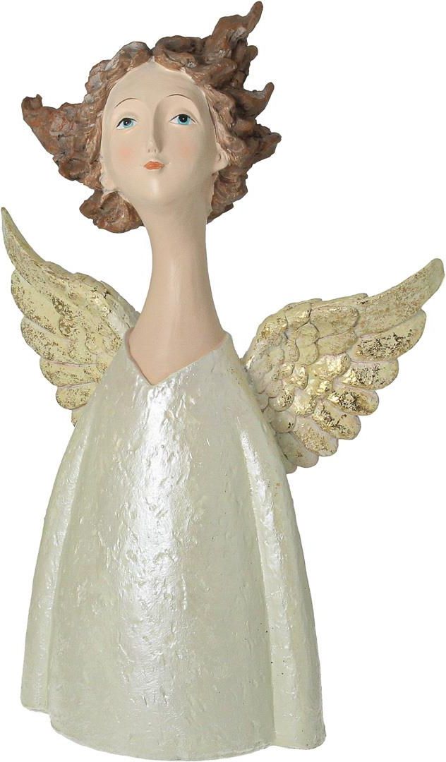 Figurka przedstawiająca anioła w białej szacie, z subtelnym połyskiem i złocistymi skrzydłami. Zjawiskowy anioł w połyskującej szacie wniesie do Twojego wnętrza wyjątkową magię świąt. Delikatnie uniesiona głowa i rozwiane włosy dodają figurce lekkości, a ręcznie rzeźbione detale podkreślają elegancję i finezję. To idealna dekoracja, która wprowadzi ciepło i duchowy spokój do każdego wnętrza, stając się symbolicznym akcentem bożonarodzeniowej atmosfery. Wymiary: szer. 29 cm, dł. 14 cm, wys. 43 cm.Materiał: polyresin.