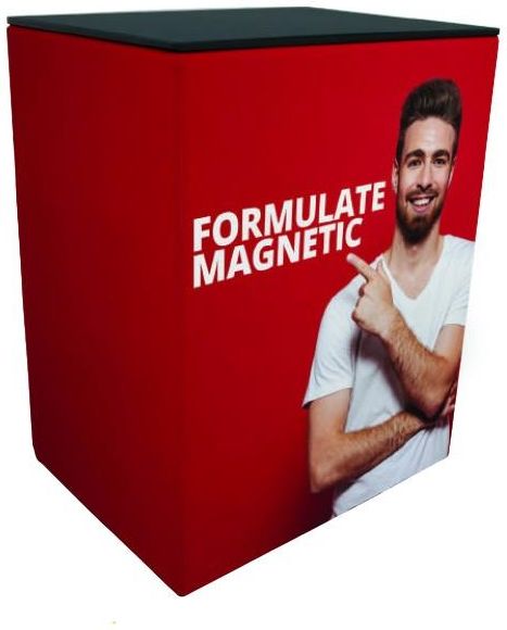 Konstrukcja z aluminiowych rur o średnicy 30 mm Łatwy montaż dzięki oznakowanym elementom Lady łączą się za pomocą umieszczonych w aluminiowych rurach magnesów Czarny blat w zestawie (maksymalne obciążenie 40 kg) Półka sprzedawana oddzielnie (maksymalne obciążenie 20 kg) Tekstylna grafika może być otwierana lub zamknięta z tyłu Blat można położyć na grafikę lub schować pod (opcja dodatkowa wymagająca zmiany szablonu graficznego)