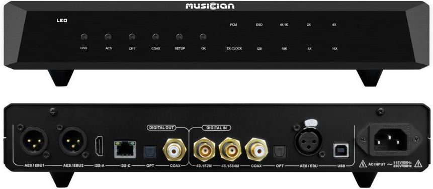 Musician Audio LEO – cyfrowy konwerter DSD to wszechstronne urządzenie, które oferuje szeroki wachlarz cyfrowych wejść i wyjść audio. Opatentowana architektura przetwarzania DSP FPGA. Precyzyjny oscylator kwarcowy stabilizowany termicznie (OCXO) zapewnia bufor FIFO i retaktowanie. Opatentowana technologia USB Audio na bazie ARM STM32F446. Licencjonowany sterownik USB Thesycon dla platformy Windows. Bez sterowników na systemach Mac i Linux. Wejścia: USB, AES/EBU, optyczne, COAX, zewnętrznych zegarów. Wyjścia: COAX, optyczne, I2S RJ45 LVCMOS, I2S HDMI LVDS, 2x AES/EBU.