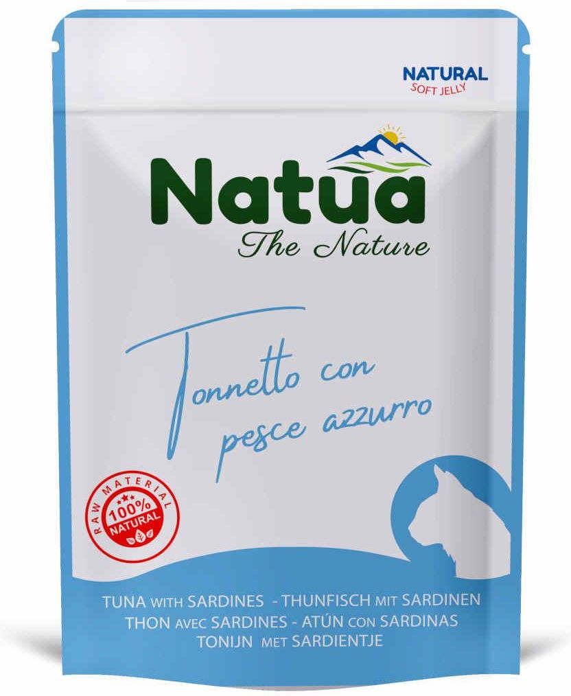 Natua Natural - 100% naturalna mokra karma dla kotów ✅ Wyłącznie naturalne składniki ✅ Bez barwników i konserwantów ✅ Bez sztucznych aromatów ✅ W przepysznej galaretce ✅ Gotowane na parze Natua Natural Tuńczyk z sardynką w galaretce 70g - naturalna klasyczna mokra karma dla dorosłych kotów. Natua Natural - w 100% naturalna uzupełniająca mokra karma dla kotów. Dla dobrego samopoczucia Twojego kota wybierz najwyższej jakości odżywianie ze starannie dobranymi produktami, które dzięki składnikom premium spełniają wszystkie jego potrzeby żywieniowe. Sekrety szefa kuchni - Wszystkie składniki są skrupulatnie wybierane, w 100% naturalne i często obrabiane ręcznie. Przepisy nie zawierają konserwantów, barwników, aromatów ani chemicznych aromatów i są dokładnie dobierane zawsze pamiętając o smaku. Dzięki wysokiej jakości składnikom stworzono unikalne receptury i przygotowano dla Ciebie szeroki wybór uzupełniających mokrych produktów spożywczych, gotowanych na parze w żelatynie, bulionie lub miękkiej galaretce i pakowanych w praktyczne puszki lub saszetki. Skład Tuńczyk 55% - Ryba tłusta 4% - Ryż 1,6% Składniki analityczne Białko surowe 13% - Tłuszcze surowe 0,8% - Popiół surowy 1% - Włókno surowe 0,5% - Wilgotność 83% Dawkowanie Do 2 saszetek dziennie, w połączeniu z pełnoporcjową karmą mokrą i suchą. Podawać w temperaturze pokojowej. Po otwarciu przechowywać w lodówce i zużyć w ciągu 48 godzin. Tuńczyk jest wspaniałym źródłem białka, o podwyższonej wartości odżywczej, obfitości kwasów tłuszczowych i obniżonej zawartości cholesterolu; niezbędnych elementów dla dobrego samopoczucia zwierząt. Użyto wyłącznie ryb bez głowy, skóry, kręgosłupa i wnętrzności. Gotowane na parze w bardzo miękkiej galaretce, idealne dla kotów, które wolą gładszą konsystencję. Zalety 100% naturalne Ręcznie robione Bez dodanych barwników i konserwantów Bez sztucznych aromatów Gotowane na parze Linia Natua Natural. Wszystko czego chcesz, nic czego nie chcesz!