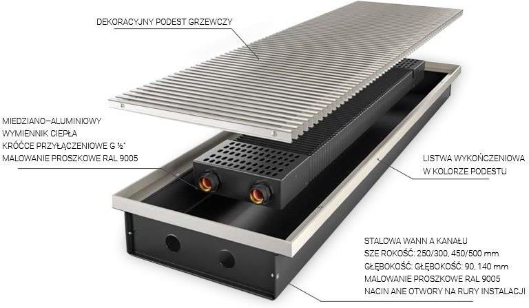 Grzejnik kanałowy ND PLUS model Standard 90/300/1800 podest w kolorze - szampan Grzejnik kanałowy współpracuje z każdym typem kotłów do temperatury 100˚C. Podłączenie grzejnika do instalacji grzewczej za pomocą dwóch króćców przyłączeniowych z gwintem wewnętrznym 1/2" i dowolnym rodzajem rury. Element grzejny stanowi miedziano-aluminiowy wymiennik ciepła, który szybko reaguje na każdą zmianę temperatury. Podłączenie grzejnika do instalacji grzewczej za pomocą dwóch króćców przyłączeniowych z gwintem wewnętrznym 1/2" i dowolnym rodzajem rury. Wymiennik zainstalowany jest w ocynkowanej wannie z blachy, pokrytej czarną farbą proszkową RAL 9005 Komplet grzejnika ND Standard uzupełniają dwa widoczne elementy ozdobne obramowanie oraz podest. Standardowe wykonanie obramowania i podestu to anodowane aluminium w kolorze Szampan. Pozostałe anodowane kolory Inox, Brąz, Czarny, Aluminium oraz malowane kolory z palety RAL na zamówienie, termin realizacji około 14 dni.