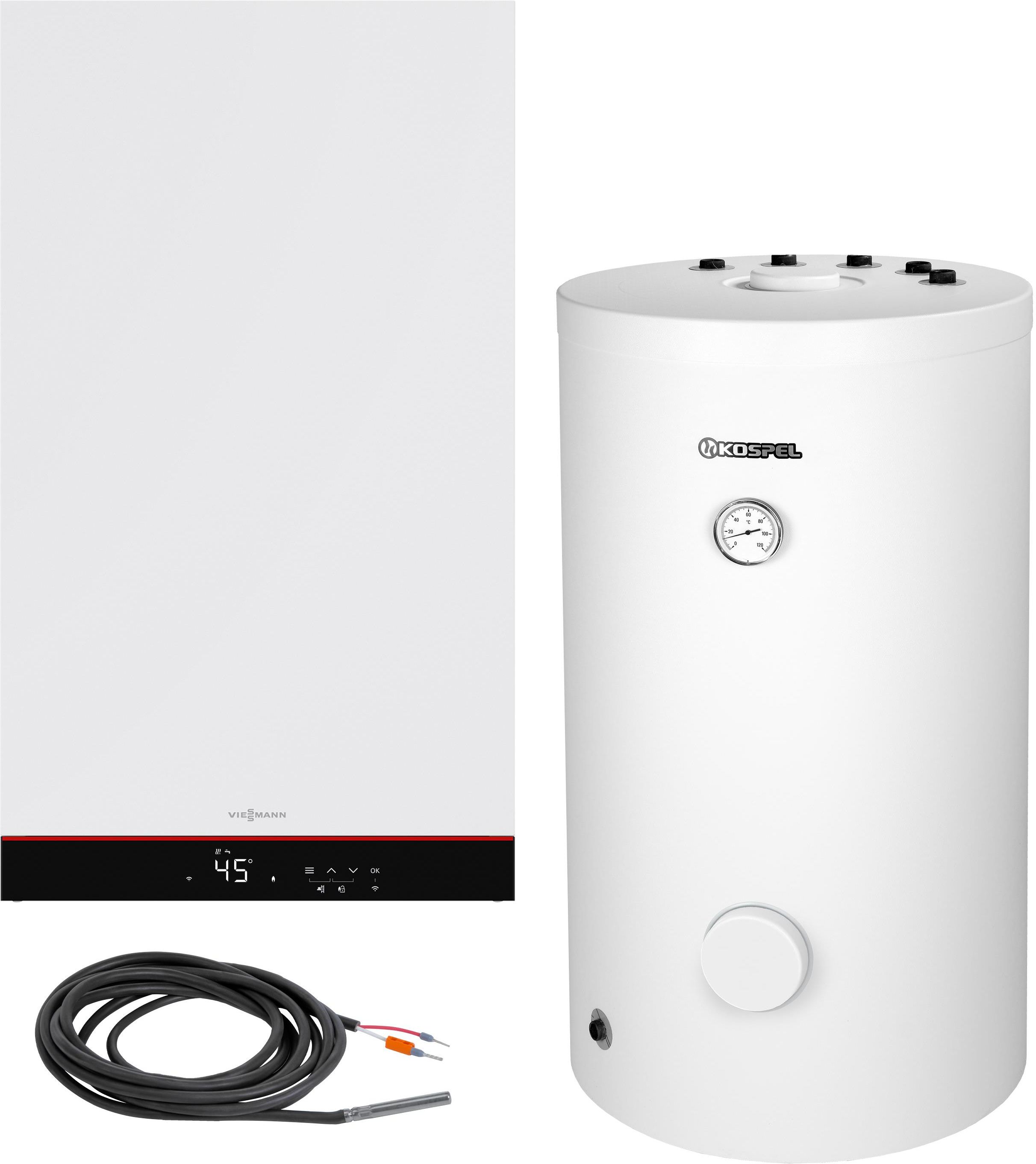 Zestaw Kociał 1-fun. kondensacyjny Vitodens 050-W B0HA 25kW ze zbiornikiem SWK-120 Przedstawiamy zestaw kocioł jednofunkcyjny kondensacyjny Viessmann Vitodens 050-W B0HA 25 kW ze zbiornikiem SWK-120 firmy Kospel– nowoczesne i efektywne rozwiązanie grzewcze, które zapewni Twojemu domowi komfort i oszczędność. Najważniejsze zalety Wysoka efektywność energetyczna: Dzięki technologii kondensacyjnej kocioł osiąga sprawność do 97%, co przekłada się na niższe zużycie gazu i mniejsze rachunki za ogrzewanie. Kompaktowe wymiary: Zaledwie 30 cm głębokości, 40 cm szerokości i 70 cm wysokości sprawiają, że kocioł idealnie nadaje się do małych przestrzeni, takich jak mieszkania czy niewielkie domy. Cicha praca: Zaawansowana konstrukcja kotła zapewnia wyjątkowo niski poziom hałasu, co zwiększa komfort użytkowania. Nowoczesny palnik MatriX-Plus: Wykonany ze stali szlachetnej palnik gwarantuje efektywną i trwałą pracę oraz niskie emisje szkodliwych substancji. Łatwa obsługa: Intuicyjny wyświetlacz LED umożliwia szybkie i proste ustawienie temperatury oraz monitorowanie pracy kotła. Zdalne sterowanie: Wbudowany moduł WiFi pozwala na zarządzanie systemem grzewczym za pomocą aplikacji ViCare, co zwiększa wygodę i bezpieczeństwo użytkowania. Dane techniczne kotła jednofunkcyjnego kondensacyjnego Vitodens 050-W BOHA 25kW Zakres znamionowej mocy grzewczej 50/30°C (w kW): 3,2-25,0 Zakres znam. mocy cieplnej przy podgrzewaniu wody użytkowej (w kW): 2,9-29,6 Moc akustyczna (wg EN ISO 15036-1)(w dB(A): 32-49 Klasa efektywności energetycznej (ogrzewanie pomieszczeń): A Klasa efektywności energetycznej (podgrzewanie wody użytkowej): A Klasa NOX: 6 Maksymalny przepływ wody użytkowej przy Δt 30 K według EN 13203 (w l/min): 14,0 Komfort korzystania z wody użytkowej zgodnie z normą EN 13203: *** Przeponowe naczynia wzbiorcze (w l): 8 Dopuszczalne ciśnienie robocze (w bar): 3 Przyłącze spalin (w Ø mm): 60 Przyłącze powietrza dolotowego (w Ø mm): 100 Wymiary (gł. x szer. x wys.): 300 x 400 x 700 mm Waga: 37 kg Sprawność: do 97% Rodzaj paliwa: gaz ziemny lub LPG Emisja hałasu: bardzo niska Dane techniczne zasobnika SWK-120 Kospel Pojemność (l): 111 Powierzchnia wężownicy (m²): 1,0 Ciśnienie znamionowe (zbiornik / wężownica) (MPa): 0,6 / 1,0 MPa Moc wężownicy (kW): 30 Grubość / materiał / rodzaj izolacji (mm): 65/PUR/NR Straty postojowe (W): 36 Model anody:M8.450 Inwestując w kocioł Viessmann Vitodens 050-W B0HA 25 kW, wybierasz niezawodność, nowoczesność i oszczędność. Zapewnij sobie i swoim bliskim ciepło oraz komfort na najwyższym poziomie. Zamów już dziś i ciesz się nowoczesnym ogrzewaniem w swoim domu!