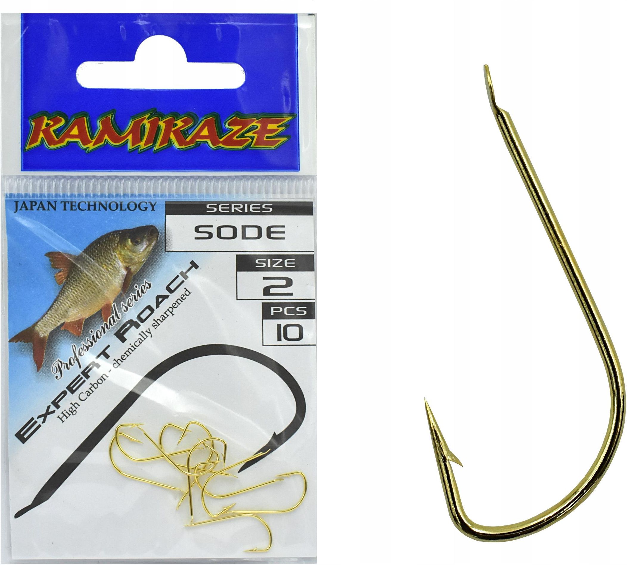 Komplet Haczyków Kamikaze SODE Nr 2 (10 szt) kod produktu: HakSODE2 Parametry: seri: SODE rozmiar haka: 2 zakończenie: z ŁOPATKĄ typ ostrza: z zadziorem materiał stal węglowa ilość szt w opakowaniu: 10 szt kolor: ZŁOTY Japan Technology SODE - Profesjonalna seria bardzo mocnych i ostrych haczyków …