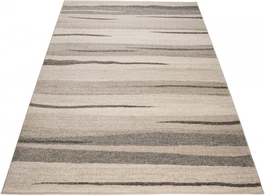 Dywan Sara 003437a beige z kolekcji Sara to prawdziwa perełka dla miłośników minimalistycznego designu z nutą nowoczesności. Jego głównym kolorem jest delikatny beż, który nadaje wnętrzu ciepła i przytulności. Beżowe tło jest subtelnie przełamane przez dodatkowe odcienie szarości, które tworzą dynamiczne, geometryczne wzory. Wzór dywanu składa się z równoległych, nieregularnych pasów, które delikatnie się rozszerzają i zwężają, nadając dywanowi ruchu i głębi. Linie te są różnej grubości, co dodaje dywanowi wyrazistości i sprawia, że nie jest on monotonny. Dywan ma kształt prostokąta, co czyni go uniwersalnym dodatkiem do różnych pomieszczeń. Nie posiada frędzli, co dodaje mu współczesnego charakteru i ułatwia utrzymanie w czystości. Wyobraź sobie wnętrze urządzone z dywanem Sara 003437a beige. W salonie, gdzie dominują neutralne barwy, dywan ten może stać się centralnym punktem, wokół którego zorganizujesz przestrzeń. Jasne ściany, szare meble i dodatki w odcieniach bieli i czerni stworzą harmonijną kompozycję. Możesz dodać kilka designerskich poduszek w kolorze szarym i beżowym, które będą współgrać z dywanem. W sypialni, dywan ten może leżeć pod łóżkiem, wprowadzając spokój i elegancję. Lampa z metalowym kloszem w kolorze srebra oraz minimalistyczne dekoracje na komodzie dopełnią aranżację. W gabinecie, gdzie potrzebujesz skupienia, dywan Sara doda subtelnej elegancji, a jego wzór nie będzie rozpraszać, lecz delikatnie pobudzać kreatywność. Dywan Sara 003437a beige to idealny wybór dla osób ceniących sobie nowoczesny design z odrobiną klasyki. Jego uniwersalna kolorystyka i wzór sprawiają, że będzie pasował zarówno do wnętrz nowoczesnych, jak i tych urządzonych w stylu skandynawskim czy industrialnym. Jeśli szukasz dywanu, który doda Twojemu wnętrzu charakteru, a jednocześnie będzie łatwy w utrzymaniu, to Sara 003437a beige jest dla Ciebie. Zachęcamy do zakupu, aby Twoje wnętrze nabrało wyjątkowego stylu i komfortu. Kolekcja SARA to szeroka gama stylowych modeli wyróżniających się nowoczesnym, geometrycznym wzornictwem w stonowanych kolorach szarości, beżów oraz brązów. Dostępne są w pełnej palecie rozmiarów. Sprawdzą się jako efektowny do salonu czy sypialni, które do każdego wnętrza wprowadzą estetyczny wygląd. Dywany z kolekcji SARA wyróżniają się gęstym włosiem 2200gr/m2 typu Frise o wysokości runa 10 milimetrów. Włókna polipropylenowe (PP) Frise mają doskonałą miękkość i sprężystość dzięki uszlachetnieniu termicznemu, a za sprawą swojej perełkowatej faktury przypominają ręcznie tkane dywany wełniane. Nie odkształcają się, wyróżniają się również wysoką odpornością na ścieranie i są łatwe do utrzymania w czystości.
