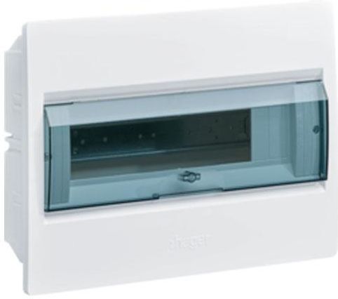 Dane techniczne: Ilość modułów: 12 Liczba rzędów: 1 Stopień ochrony: IP 40 Drzwi transparentne. Prąd znamionowy: dla aparatury do 63 A Napięcie znamionowe: AC 400 V / 50 Hz Próba rozżarzonego drutu: 650°C II klasa izolacji Produkt zgodny z dyrektywą RoHS Kolor: biały, RAL 9010 Montaż podtynkowy. Wymiary [mm]: Głębokość produktu: 91,4 mm Wysokość produktu: 226 mm Szerokość produktu: 308 mm Zalety produktu: rozwiązanie kompaktowe, dostosowane do zastosowań w prostych instalacjach, zawiera wszystkie konieczne akcesoria, zoptymalizowana przestrzeń dla przeprowadzenia przewodów, przemyślany sposób montażu szyn TH pozwalający na uniknięcie błędów montażowych i skracający czas prefabrykacji, neutralna stylistyka pozwalająca na zachowanie estetyki każdego pomieszczenia. Rodzina rozdzielnic Cosmos firmy Hager, jest dedykowana do realizacji bezpiecznego rozdziału energii w obiektach mieszkaniowych. Stanowią one bazę do budowy rozdzielnic końcowych w ramach kilku prostych referencji. Nawet w najmniejszych mieszkaniach i pomieszczeniach socjalnych, gdzie przestrzeń jest parametrem krytycznym, w pomieszczeniach poddawanych renowacji, małych apartamentach i pokojach hotelowych, wszędzie tam użytkownicy poszukują rozwiązań o wysokiej jakości i estetyce.