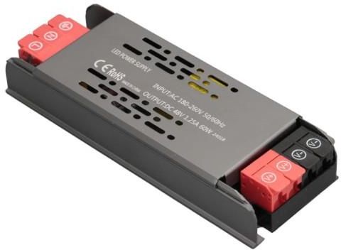 Profesjonalny wąski zasilacz LED na 48 V i moc 60 W Wysokiej jakości zasilacz stałonapięciowy do oświetlenia LED to profesjonalny transformator do zasilania ledów na napięcie 48 V DC o mocy 60 W w ultrawąskiej półotwartej metalowej obudowie. Wąski zasilacz do pasków LED na 48V, "żarówek" LED i modułów LED na 48V. Zasilacz modułowy Led 48V jest zasilaczem do montażu w suchej zabudowie, w rozdzielni elektrycznej lub w pomieszczeniu w miejscach bezpiecznych. Zasilacz posiada półotwartą metalową obudowę modułową. Przyłącza zasilające na 230V i na 48V są przyłączami otwartymi, więc ze względu na bezpieczeństwo użytkowników, zasilacz modułowy należy montować w miejscach, gdzie nie wystąpi ryzyko przypadkowego dotknięcia przez człowieka lub zwierzę. Zasilacz do LED 48 V 60 W to podstawowy zasilacz w półotwartej obudowie wspierającej chłodzenie, który znajdzie swoje zastosowanie w podstawowych instalacjach oświetleniowych w domu i biurze. Zasilacz do taśmy LED powinien mieć to samo napięcie (V) co taśma oraz około 20% zapasu mocy (W), aby nie pracował na maksymalnym obciążeniu (większa awaryjność i krótsza żywotność instalacji). Nie wiesz, jak dobrać zasilacz do LED? Przeczytasz o tym tu: zasilacze do LED. Podstawowe zastosowanie zasilacza modułowego LED: zasilanie pasków LED na 48V, zasilanie do listwy LED na 48V, zasilanie modułów LED 48V, zasilanie żarówek LED G4 i MR16 na 48V. Podstawowe parametry zasilacza LED 48V Ultra Slim: napięcie znamionowe na wyjściu: 48 V DC, moc znamionowa: 60 W, znamionowe obciążenie prądowe: 1,25 A, sprawność zasilacza: ⩾86%, maksymalne bezpieczne obciążenie dla zasilacza: 48 W, napięcie zasilania na wejściu: 170-240 V AC, częstotliwość napięcia zasilania: 50-60Hz, zabezpieczenie przeciążeniowe: tak, zabezpieczenie zwarciowe: tak, zabezpieczenie przepięciowe: tak, klasa szczelności: IP20, chłodzenie zasilacza: pasywne, obudowa zasilacza: modułowa metalowa Ultra Slim Graphite, gniazda przyłączeniowe: zaciski bezśrubowe, wymiary zewnętrzne zasilacza (dł. x szer. x wys.): 136 x 50 x 24 mm.