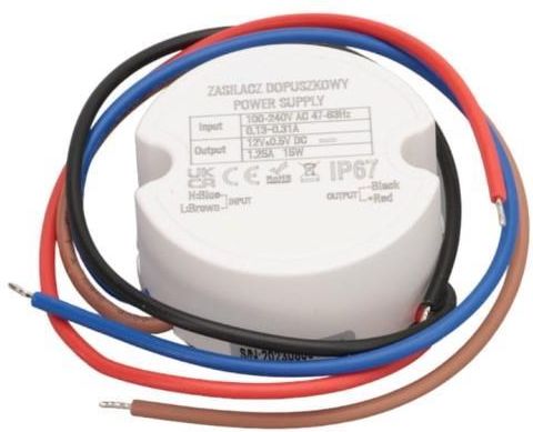 Zasilacz LED do puszkowy 12V DC, 15 Watt. Stałonapięciowy zasilacz dopuszkowy na napięcie DC 12V o mocy 15 Watt, w hermetycznej obudowie IP67 do puszki fi 60mm. Zasilacz Led który można montować w puszce elektrycznej o średnicy 60mm. Zasilacz sprawdzi się również w pomieszczeniach o dużej wilgotności jak łazienka, kuchnia, kotłownia, garaż lub na zewnątrz. Zasilacz posiada wodooporną obudowę, IP67, która chroni zasilacz przed wilgocią i przypadkowymi kroplami wody. Podstawowe zalety zasilacza puszkowego LED: hermetyczna plastikowa obudowa IP67, możliwość montażu zasilacz w puszce o średnicy 60mm, stabilizacja napięcia DC 12V, cicha praca zasilacza przy współpracy ze ściemniaczami Led PWM, Podstawowe zastosowanie puszkowego LED: do zasilania oświetlenia Led w łazience, do zasilania oświetlania na zewnątrz, zasilanie ledów w listwie oświetleniowej, zasilanie do ledów w szafach i meblach, zasilanie oświetlenia Led w pomieszczeniach o dużej wilgotności, Podstawowe parametry zasilacza puszkowego LED: napięcie znamionowe na wyjściu: DC12V, moc znamionowa: 15 Watt, znamionowe obciążenie prądowe: 1.25A, sprawność zasilacza: ⩾79%, maksymalne bezpieczne obciążenie dla zasilacza: 12 Watt, napięcie zasilania na wejściu: AC 100V-240V, częstotliwość napięcia zasilania: 47Hz-63Hz, zabezpieczenie przeciążeniowe: tak, zabezpieczenie zwarciowe: tak, zabezpieczenie nadpięciowe: tak, klasa ochronności: II, klasa szczelności: IP67, chłodzenie zasilacza: pasywne, obudowa zasilacza: hermetyczna plastikowa, długość przewodów przyłączeniowych: 140mm wymiary zewnętrzne zasilacza ( x dł.): 50mm x 22mm.