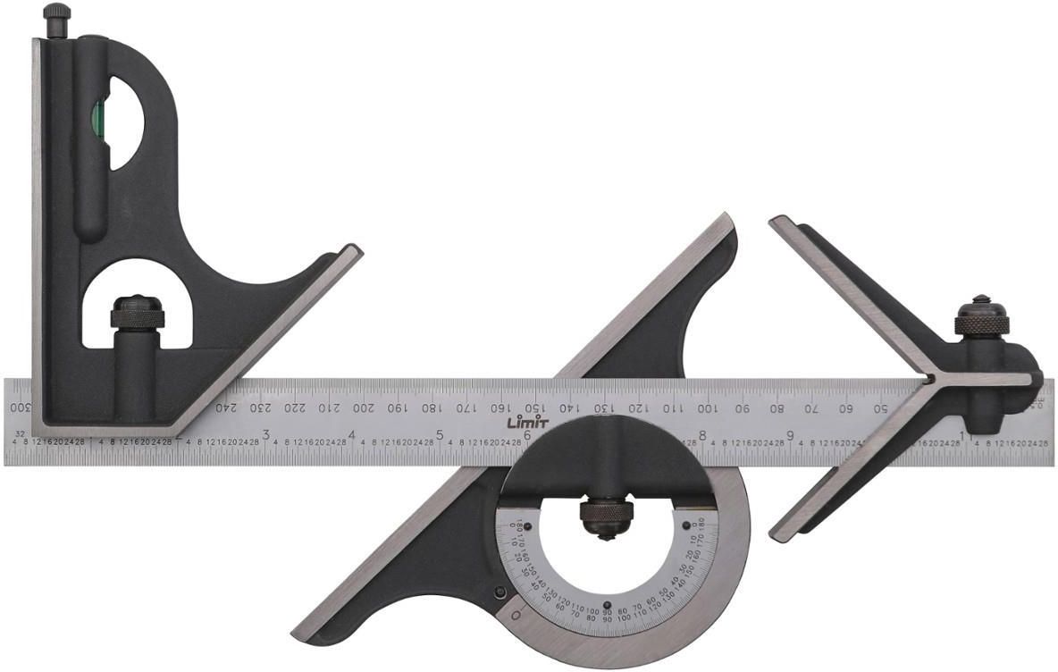 KĄTOWNIK WIELOFUNKCYJNY KOMBINOWANY 300mm LIMIT Model : 266850106 Wykonany ze stali węglowej, z elementami regulacyjnymi ze stali nierdzewnej. Z kątomierzem tarczowym, przekładnią kątową i głowicą środkującą. Wszystkie części są przesuwane na liniale z podziałką. Ampułka poziomowania na tarczy …