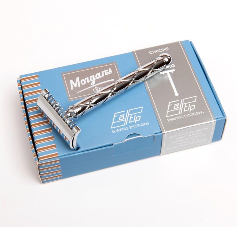 Morgan's Klasyczna maszynka do golenia ze zdobioną rączką ze stali nierdzewnej. Dobrze wyważona, z otwartą głowicą na klasyczne żyletki, która goli praktycznie wszystko – nie musisz oszczędzać na piłę. Wyprodukowana we współpracy fitm Morgan's i Fatip we Włoszech.