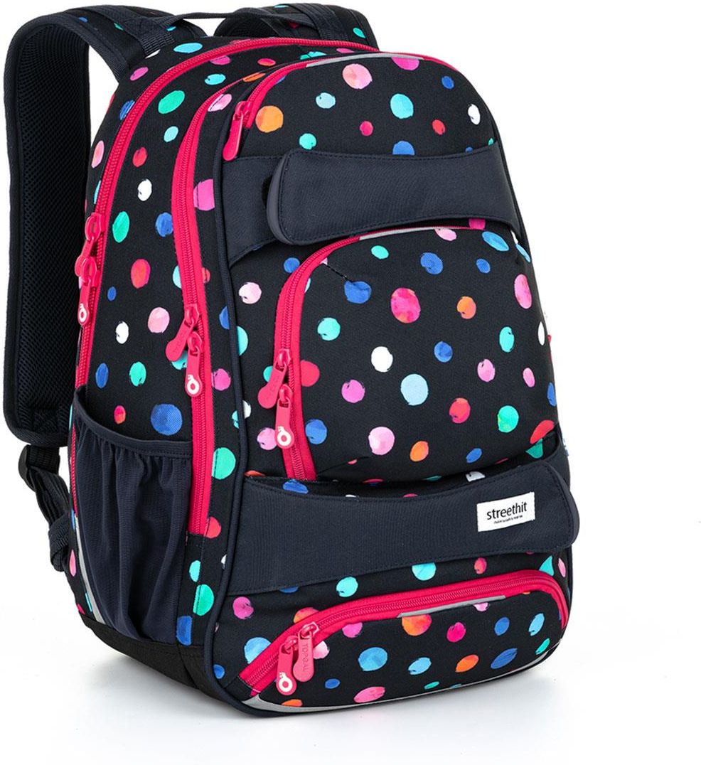 Cechy główne: dwie pojemne komory, trzy kieszenie z przodu, dwie z boków do 6-8 klasy i do szkoły średniej, od 150 cm wzrostu sztywne plecy z lekkim stelażem aluminiowym Krój plecaka YUMI to jeden z najczęściej wybieranych przez młodzież. Motyw kropek jest bardzo uniwersalny, będzie pasować dla dziewczyny do 6-8 klasy. Plecy w plecaku YUMI są sztywne, mają w środku lekki stelaż aluminiowy oraz są grubo wypełnione. Szelki też są grubo wypełnione, są szerokie i mają pas piersiowy. Taki system pozwala na wygodne przenoszenie nawet ciężkiego plecaka. Tylna komora plecaka jest pojemna, przeznaczona na przenoszenie najcięższych książek, formatu A4. Znajduje się w niej wąska kieszonka ze stelażem -można go wyjąć w celu wyczyszczenia plecaka, ale polecamy go nosić każdego dnia. To właśnie stelaż nadaje plecom ich prawidłowy kształt. W komorze znajduje się także kieszeń na laptopa oraz mniejsza na np. smartfon. Jeśli nie nosisz elektroniki ze sobą do szkoły to kieszeń może posłużyć na przenoszenie zeszytów. Przednia komora jest mniejsza, wewnątrz znajduje się siateczkowa kieszeń na dokumenty oraz karabińczyk na klucze na długim pasku. Na przodzie plecaka są 3 kieszenie, które są wizualnie oddzielone pasami zapinanymi na rzepy. Do pasów możesz przypiąć kurtkę, bluzę, czy nawet deskę skateboradową. Z boku plecaka są dwie kieszenie z siateczki. Jedna z nich posiada pas kompresyjny do przypięcia butelki o max pojemności 1,5 litra, nie będzie wypadać w biegu do szkoły. Materiał plecaka jest wodoodporny. Tak samo jak dno wykonane z materiału TOPDURA, które dodatkowo jest odporne na przeciążenia. Odblaski są umieszczone z przodu plecaka, z boków i na szelkach. Do plecaka można dokupić piórnik ETUE 22031 w takim samym designie. Piórnik etui spokojnie zmieści się do jednej z kieszeń na przodzie plecaka. Dodatkowo: pojemność 27 litrów metalowe uchwyty zamków grube dno z materiału TOPDURA, wodoodporne, odporne na ścieranie uchwyt do przenoszenia plecaka w ręce