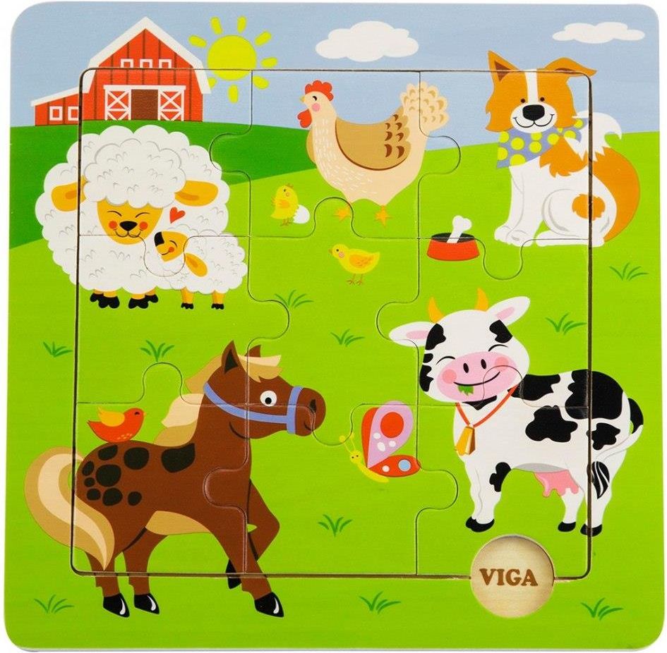 Viga 50837 Puzzle na podkładce farma Już od najmłodszych lat dziecka należy zadbać o jego rozwój. Od drugiego roku życia kształtują się podstawowe procesy myślowe, a ich prawidłowy rozwój w tym czasie jest gwarancją późniejszych sukcesów w dorosłym życiu. Jedną z form łączenia zabawy z nauką jest układanie puzzli. Badania naukowe potwierdzają, iż dzieci, które bawią się w układanie puzzli mają później lepsze zdolności przestrzenne. Piękne i barwne puzzle posiadają podkładkę na której umieszczony jest wzór który dziecko ma ułożyć z rozsypanych elementów, co nie spowoduje zniechęcenia dziecka do dalszej zabawy a jest to bardzo istotne na początku edukacji, nawet w formie zabawy. Kolorowe postaci na obrazkach przyciągną uwagę, wspomogą naukę kolorów a także nazw zwierząt mieszkających na farmie. Puzzle składają się z 9 elementów + podkładka ze wzorem. Całość wykonana została z drewna bukowego i pomalowana nietoksycznymi farbami o żywych barwach. Naszym priorytetem jest bezpieczeństwo dzieci oraz najwyższa jakość zabawek, dbamy zatem o to, aby farby którymi malujemy nasze zabawki nie były toksyczne i spełniały normy bezpieczeństwa (EN71 i ASTM). Zabawka przeznaczona dla dzieci powyżej 18 miesiąca życia. Wymiary produktu: dł.225mm x szer.225mm x wys.10mm