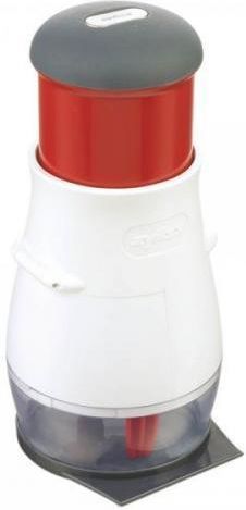 Siekacz marki Zyliss szybko i sprawnie posieka szeroką gamę produktów spożywczych, których używasz na codzień w swojej kuchni. Idealne urządzenie do cebuli, czekolady, ziół, pomidorów, orzechów. Ostrza ze stali nierdzewnej obracają się z każdym naciśnięciem tłoka - co znacznie podnosi efektywność urządzenia, a sprytne wycieraczki zgarniają żywność ze ścianek pojemnika, przez co wszystko jest równomiernie posiekane. Możesz kroić bezpośrednio na desce, lub na czarnej podstawce. Pojemnik posiada miarkę - max. 200 ml. Siekacz ma wysokość 23 cm, na czas przechowywania posiada blokadę tłoku - zajmuje mniej miejsca. Góra tłoku jest wykonana z miłego w dotyku tworzywa. Po skończonej pracy, łatwo jest go umyć - dolna część jest rozkładana.