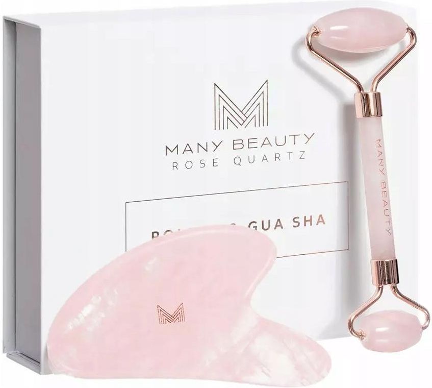 Many Beauty - Rose Quartz Roller & Gua Sha - Zestaw do masażu twarzy - Kwarcowy roller & Płytka Gua Sha Rose Quartz Roller & Gua Sha marki Many Beauty. Zestaw do masażu twarzy. Składa się dwustronnego rollera wykonanego z różowego kwarcu oraz płytki Gua Sha. Chłodny roller zamyka pory skóry, wspomaga drenaż limfy, co znacząco mniejsza obrzęki, a także zmniejsza opuchliznę i cienie pod oczami. Dodatkowo roller działa przeciwzmarszczkowo, ujędrnia i uelastycznia naskórek. Dwie różnej wielkości końcówki pozwolą zastosować go w różnych partiach twarzy. Płytka Gua Sha doskonale sprawdzi się podczas masażu twarzy. Posiada specjalnie wyprofilowany kształt, który dopasowuje się do struktury twarz. Posiada potwierdzone działanie antystresowe i wygładzające bruzdy i zmarszczki. Dodatkowo relaksuje, odpręża, uelastycznia i odmładza. Zestaw został zamknięty w eleganckim kartonie, idealnym na prezent, bądź jako kasetka na drobiazgi. Zestaw. Do masażu twarzy. Składa się z rollera i płytki Gua Sha. Idealny na prezent dla bliskiej osoby.