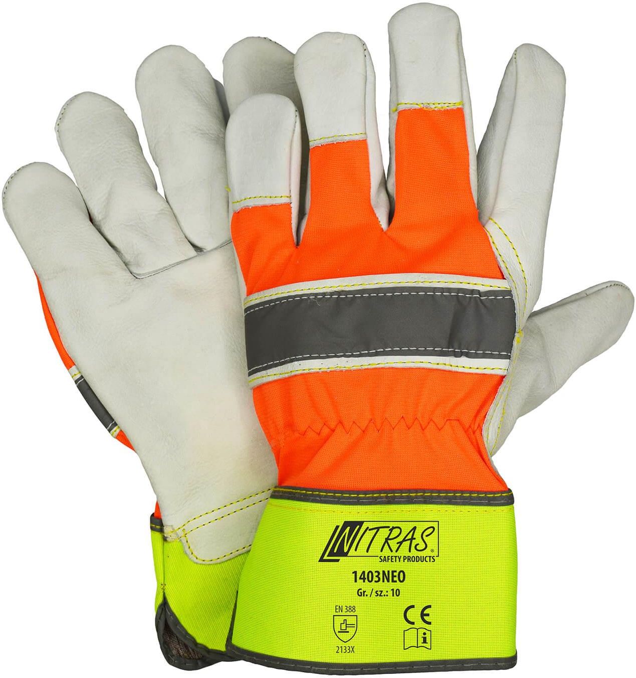 Rękawice robocze skórzane Nitras Neo 1403NEO, wykonane z licowej skóry bydlęcej. Podszewka wykonana z materiału tekstylnego w kolorze neonowym pomarańczowym. Gumowany mankiet w kolorze żółtym, pasy odblaskowe, podwójne szwy, skóra wysokiej jakości. Rękawica posiada elementy odblaskowe zapewniające dobrą widoczność pracownika. Dedykowane do prac w branży drogowej, budownictwie, dla działów utrzymania ruchu. Materiał: Licowana skóra bydlęca, bawełna Dostępne rozmiary: 10 Opakowanie zbiorcze: 60 par w kartonie (12 par w opakowaniu) Normy i certyfikaty: EN 388 (2 1 3 3 X), EN 420 (5)